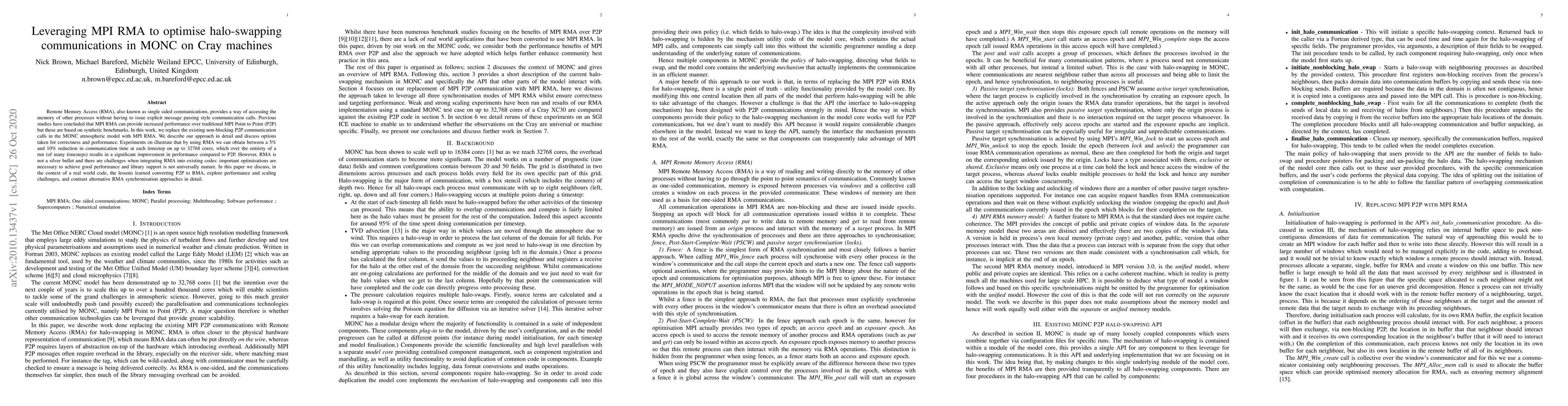 This paper investigates the use of MPI Remote Memory Access (RMA) to optimize halo-swapping communications in the MONC atmospheric model on Cray machines, achieving a 5% to 10% reduction in communication time per timestep compared to traditional MPI Point to Point (P2P) communication. The study highlights the challenges and necessary optimizations for successful RMA integration.