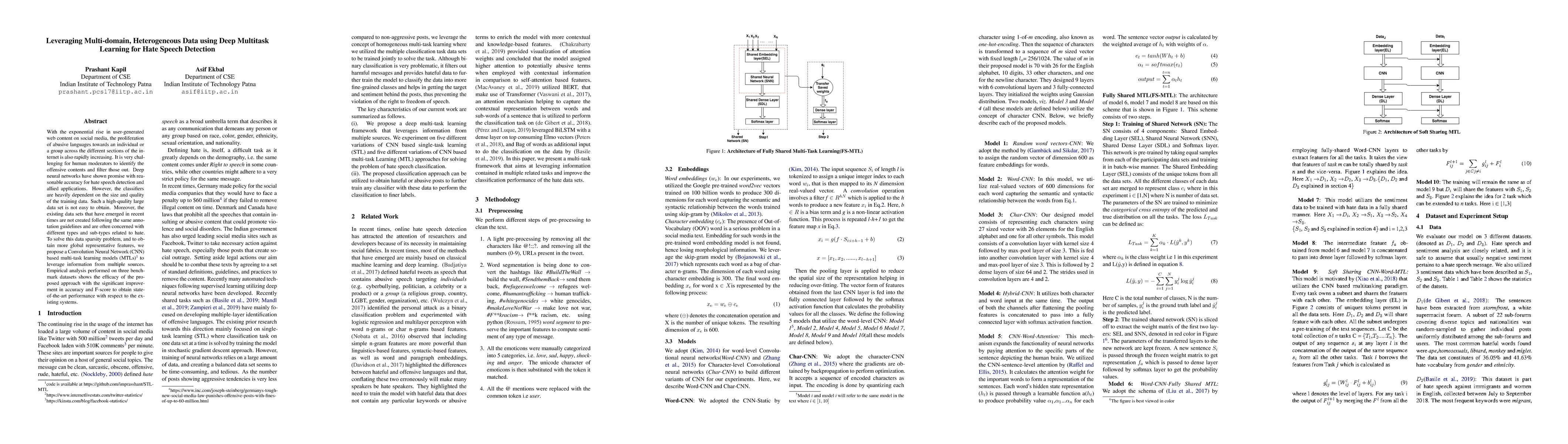 With the exponential rise in user-generated web content on social media, the proliferation of abusive languages towards an individual or a group across the different sections of the internet is also rapidly increasing. It is very challenging for human moderators to identify the offensive contents and filter those out. Deep neural networks have shown promise with reasonable accuracy for hate speech detection and allied applications. However, the classifiers are heavily dependent on the size and quality of the training data. Such a high-quality large data set is not easy to obtain. Moreover, the existing data sets that have emerged in recent times are not created following the same annotation guidelines and are often concerned with different types and sub-types related to hate. To solve this data sparsity problem, and to obtain more global representative features, we propose a Convolution Neural Network (CNN) based multi-task learning models (MTLs)\footnote{code is available at https://github.com/imprasshant/STL-MTL} to leverage information from multiple sources. Empirical analysis performed on three benchmark datasets shows the efficacy of the proposed approach with the significant improvement in accuracy and F-score to obtain state-of-the-art performance with respect to the existing systems.
