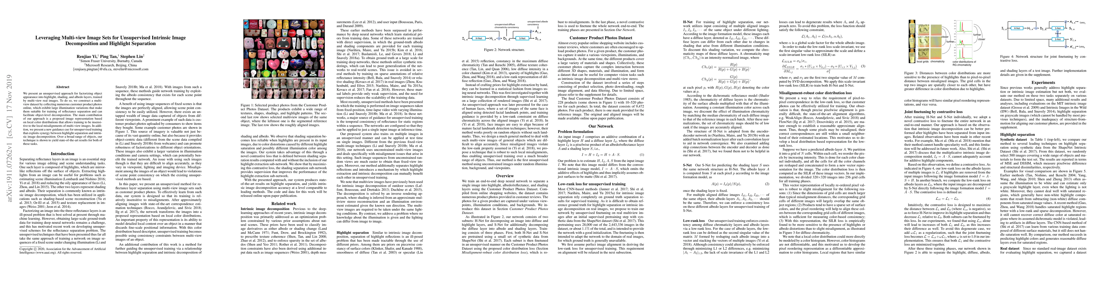 We present an unsupervised approach for factorizing object appearance into highlight, shading, and albedo layers, trained by multi-view real images. To do so, we construct a multi-view dataset by collecting numerous customer product photos online, which exhibit large illumination variations that make them suitable for training of reflectance separation and can facilitate object-level decomposition. The main contribution of our approach is a proposed image representation based on local color distributions that allows training to be insensitive to the local misalignments of multi-view images. In addition, we present a new guidance cue for unsupervised training that exploits synergy between highlight separation and intrinsic image decomposition. Over a broad range of objects, our technique is shown to yield state-of-the-art results for both of these tasks.