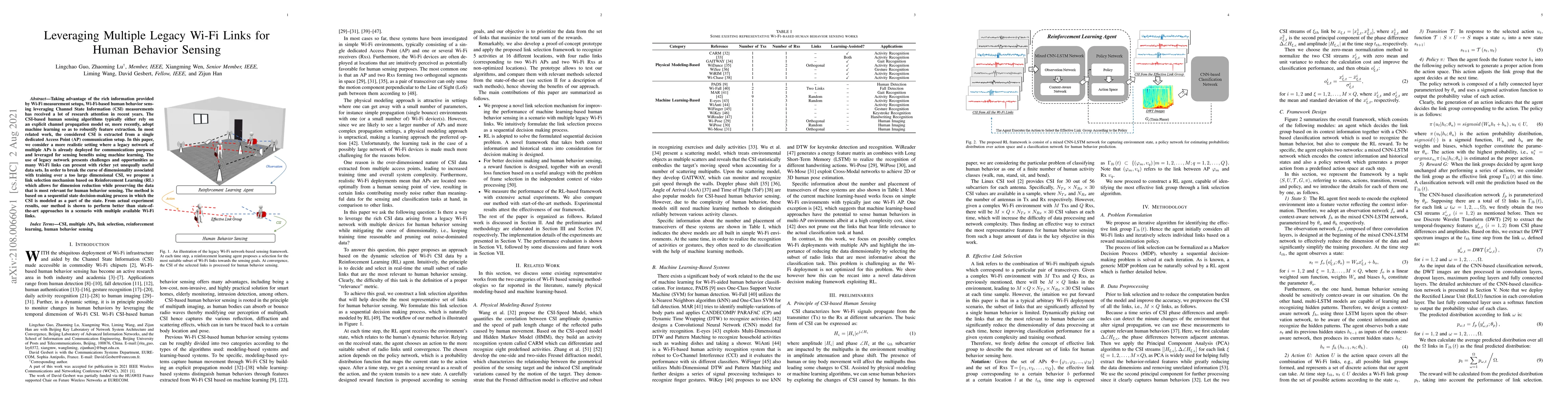 This paper proposes a Reinforcement Learning-based method to select the most relevant Wi-Fi links for human behavior sensing from a legacy network of multiple Access Points, addressing the curse of dimensionality in Channel State Information (CSI) data. Experimental results demonstrate superior performance compared to existing techniques.