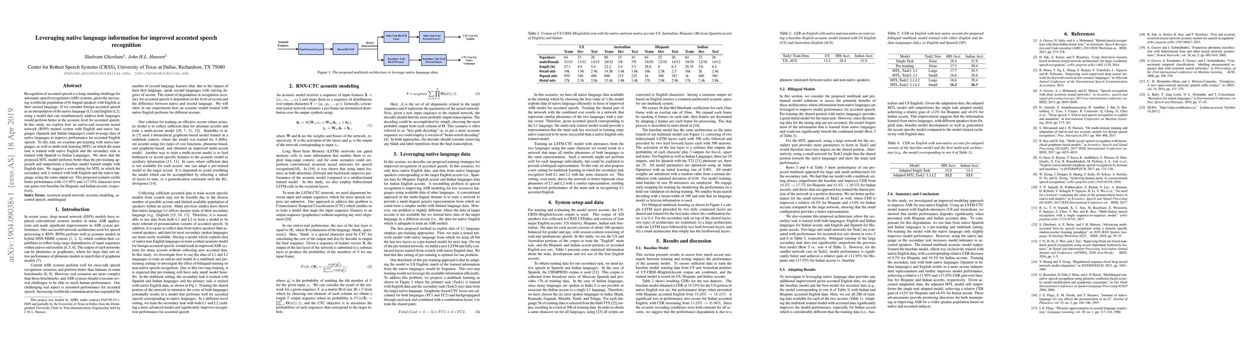 This study investigates leveraging native language information to improve recognition of accented English speech using a recurrent neural network (RNN). The proposed multi-task learning model, which trains on both native and English languages, outperforms traditional English-only models, achieving significant gains in accuracy for Hispanic and Indian accented speech.