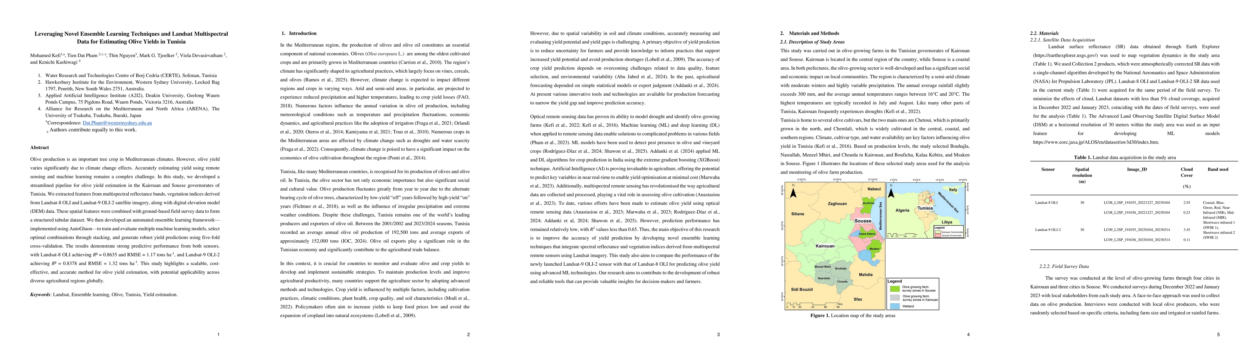 Olive production is an important tree crop in Mediterranean climates. However, olive yield varies significantly due to climate change. Accurately estimating yield using remote sensing and machine learning remains a complex challenge. In this study, we developed a streamlined pipeline for olive yield estimation in the Kairouan and Sousse governorates of Tunisia. We extracted features from multispectral reflectance bands, vegetation indices derived from Landsat-8 OLI and Landsat-9 OLI-2 satellite imagery, along with digital elevation model data. These spatial features were combined with ground-based field survey data to form a structured tabular dataset. We then developed an automated ensemble learning framework, implemented using AutoGluon to train and evaluate multiple machine learning models, select optimal combinations through stacking, and generate robust yield predictions using five-fold cross-validation. The results demonstrate strong predictive performance from both sensors, with Landsat-8 OLI achieving R2 = 0.8635 and RMSE = 1.17 tons per ha, and Landsat-9 OLI-2 achieving R2 = 0.8378 and RMSE = 1.32 tons per ha. This study highlights a scalable, cost-effective, and accurate method for olive yield estimation, with potential applicability across diverse agricultural regions globally.
