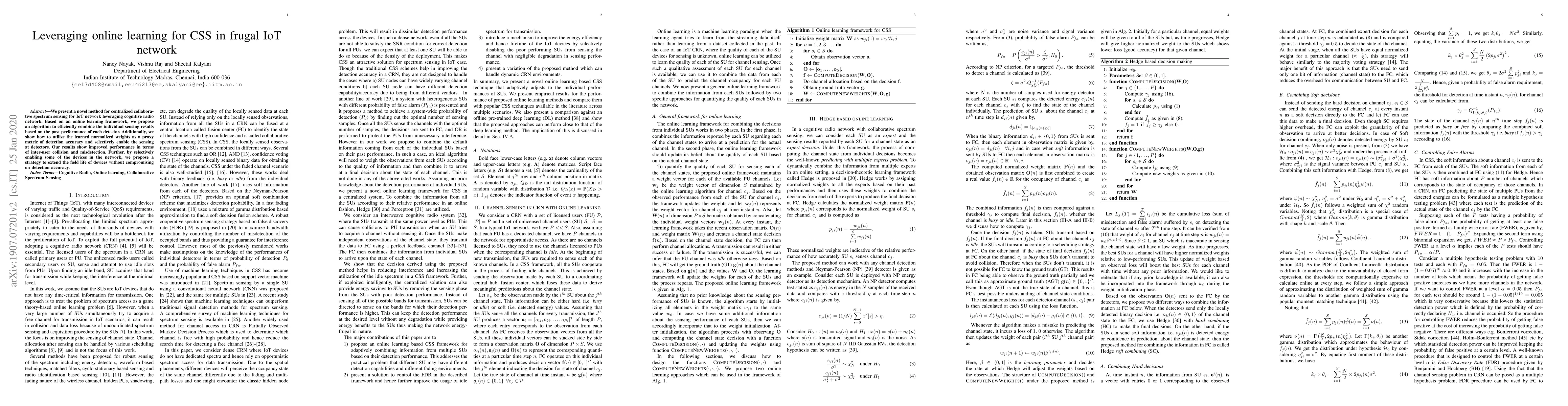 We present a novel method for centralized collaborative spectrum sensing for IoT network leveraging cognitive radio network. Based on an online learning framework, we propose an algorithm to efficiently combine the individual sensing results based on the past performance of each detector. Additionally, we show how to utilize the learned normalized weights as a proxy metric of detection accuracy and selectively enable the sensing at detectors. Our results show improved performance in terms of inter-user collision and misdetection. Further, by selectively enabling some of the devices in the network, we propose a strategy to extend the field life of devices without compromising on detection accuracy.