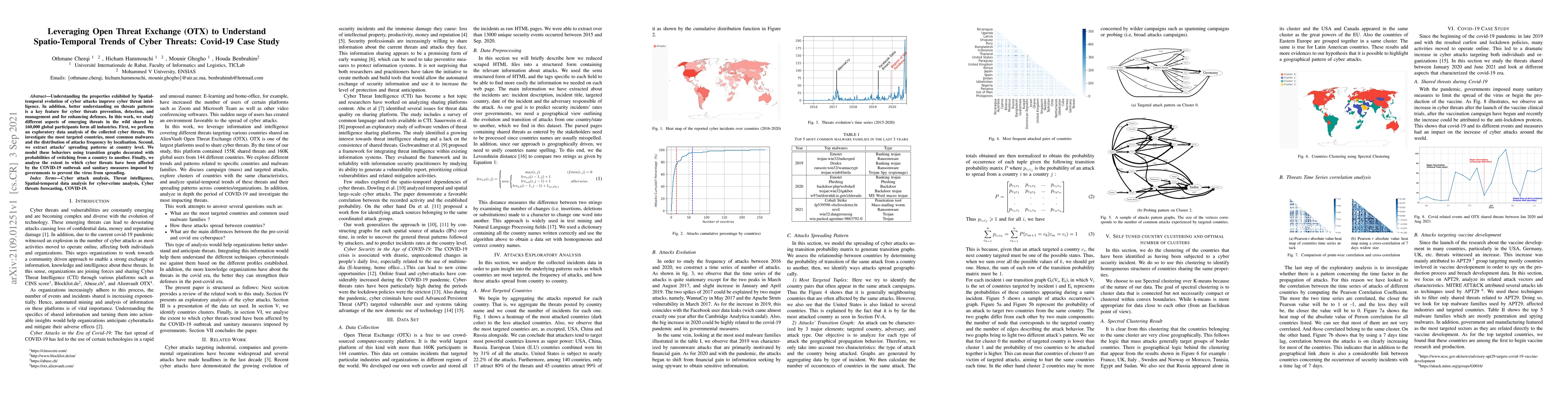 Understanding the properties exhibited by Spatial-temporal evolution of cyber attacks improve cyber threat intelligence. In addition, better understanding on threats patterns is a key feature for cyber threats prevention, detection, and management and for enhancing defenses. In this work, we study different aspects of emerging threats in the wild shared by 160,000 global participants form all industries. First, we perform an exploratory data analysis of the collected cyber threats. We investigate the most targeted countries, most common malwares and the distribution of attacks frequency by localisation. Second, we extract attacks' spreading patterns at country level. We model these behaviors using transition graphs decorated with probabilities of switching from a country to another. Finally, we analyse the extent to which cyber threats have been affected by the COVID-19 outbreak and sanitary measures imposed by governments to prevent the virus from spreading.