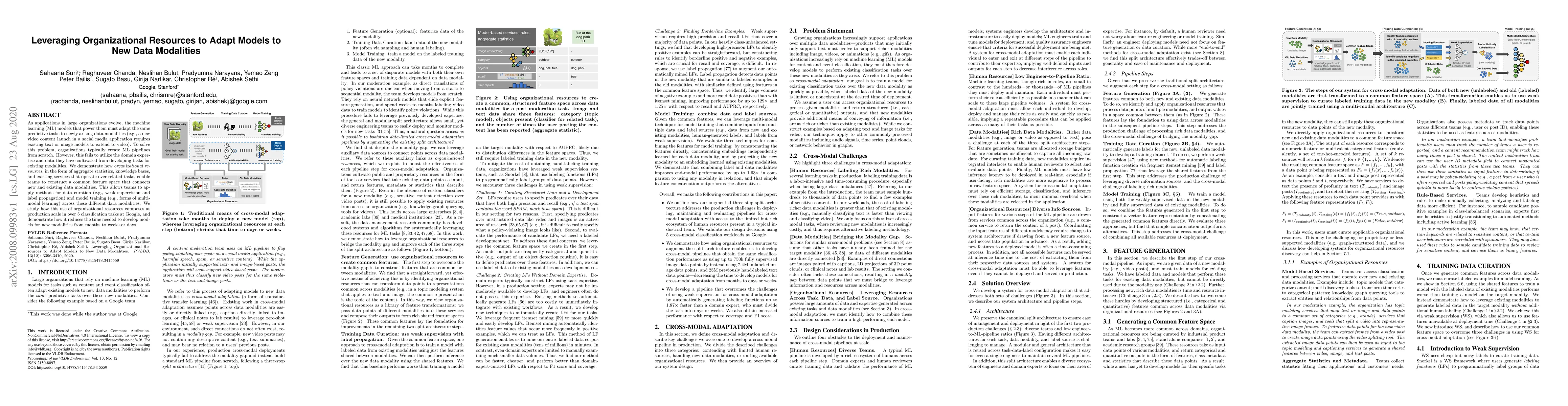 As applications in large organizations evolve, the machine learning (ML) models that power them must adapt the same predictive tasks to newly arising data modalities (e.g., a new video content launch in a social media application requires existing text or image models to extend to video). To solve this problem, organizations typically create ML pipelines from scratch. However, this fails to utilize the domain expertise and data they have cultivated from developing tasks for existing modalities. We demonstrate how organizational resources, in the form of aggregate statistics, knowledge bases, and existing services that operate over related tasks, enable teams to construct a common feature space that connects new and existing data modalities. This allows teams to apply methods for training data curation (e.g., weak supervision and label propagation) and model training (e.g., forms of multi-modal learning) across these different data modalities. We study how this use of organizational resources composes at production scale in over 5 classification tasks at Google, and demonstrate how it reduces the time needed to develop models for new modalities from months to weeks to days.