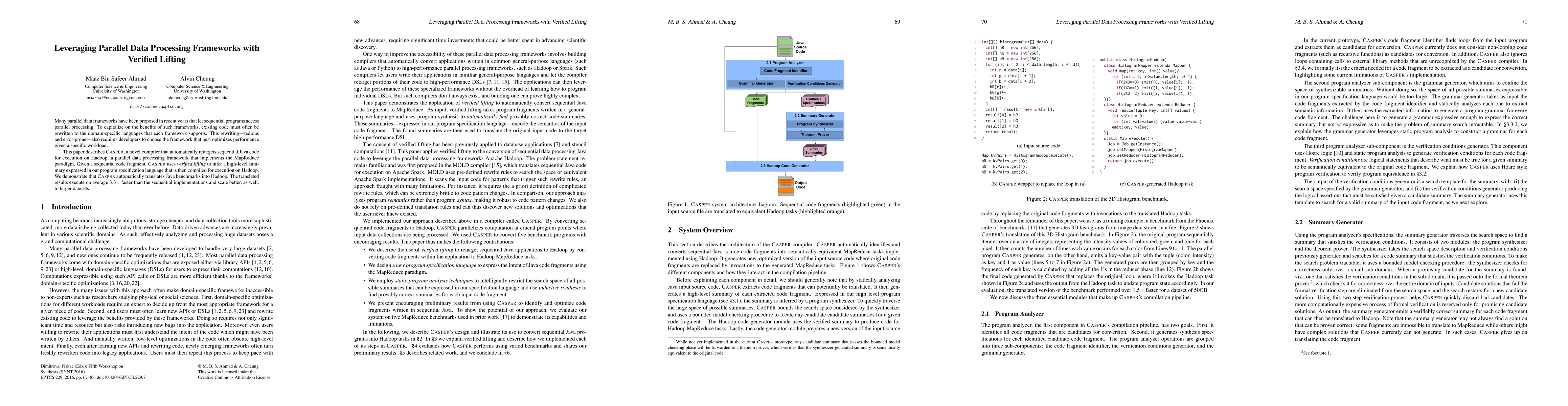 This paper introduces Casper, a compiler that automatically retargets sequential Java code for execution on Hadoop using verified lifting. Casper translates Java benchmarks into Hadoop, achieving on average 3.3x faster execution and better scalability for larger datasets compared to sequential implementations.