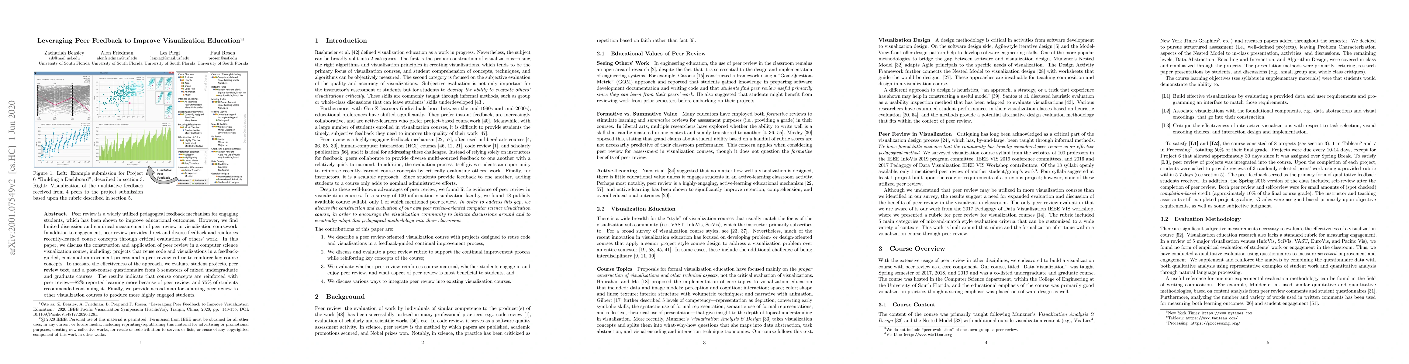 This paper explores the use of peer feedback in computer science visualization courses to enhance student engagement and learning. Results from three semesters show that 82% of students felt they learned more through peer review, with 75% recommending its continuation.