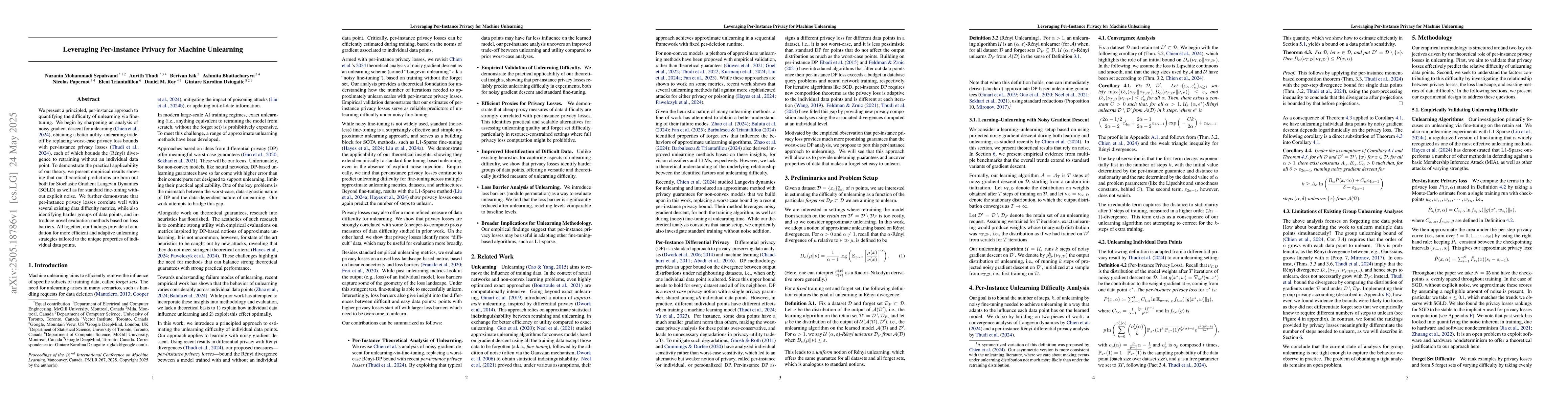 The research presents a per-instance approach to quantify unlearning difficulty via fine-tuning, sharpening the analysis of noisy gradient descent for unlearning, and replacing worst-case privacy loss bounds with per-instance privacy losses to achieve a better utility-unlearning tradeoff.