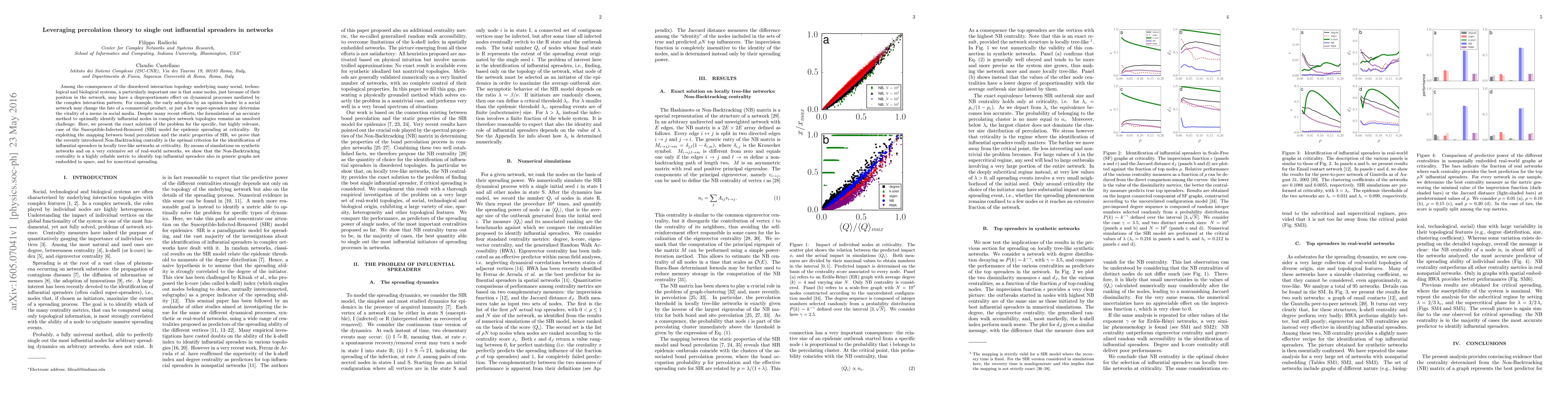 This research paper proposes that the Non-Backtracking centrality is the optimal method for identifying influential spreaders in networks, particularly in the context of the Susceptible-Infected-Removed (SIR) model for epidemic spreading. Simulations confirm its reliability across various synthetic and real-world networks.