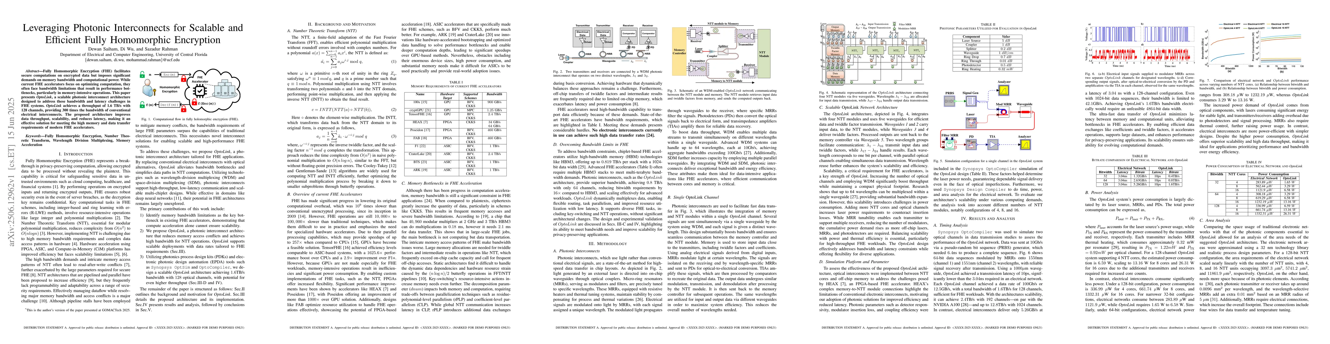 Fully Homomorphic Encryption (FHE) facilitates secure computations on encrypted data but imposes significant demands on memory bandwidth and computational power. While current FHE accelerators focus on optimizing computation, they often face bandwidth limitations that result in performance bottlenecks, particularly in memory-intensive operations. This paper presents OptoLink, a scalable photonic interconnect architecture designed to address these bandwidth and latency challenges in FHE systems. OptoLink achieves a throughput of 1.6 TB/s with 128 channels, providing 300 times the bandwidth of conventional electrical interconnects. The proposed architecture improves data throughput, scalability, and reduces latency, making it an effective solution for meeting the high memory and data transfer requirements of modern FHE accelerators.