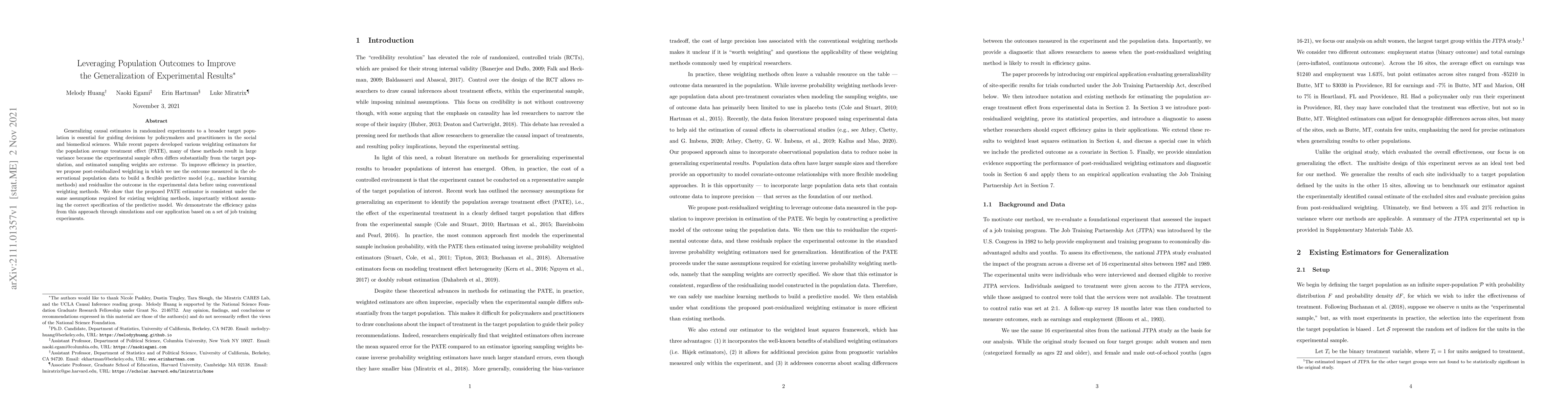 Generalizing causal estimates in randomized experiments to a broader target population is essential for guiding decisions by policymakers and practitioners in the social and biomedical sciences. While recent papers developed various weighting estimators for the population average treatment effect (PATE), many of these methods result in large variance because the experimental sample often differs substantially from the target population, and estimated sampling weights are extreme. To improve efficiency in practice, we propose post-residualized weighting in which we use the outcome measured in the observational population data to build a flexible predictive model (e.g., machine learning methods) and residualize the outcome in the experimental data before using conventional weighting methods. We show that the proposed PATE estimator is consistent under the same assumptions required for existing weighting methods, importantly without assuming the correct specification of the predictive model. We demonstrate the efficiency gains from this approach through simulations and our application based on a set of job training experiments.