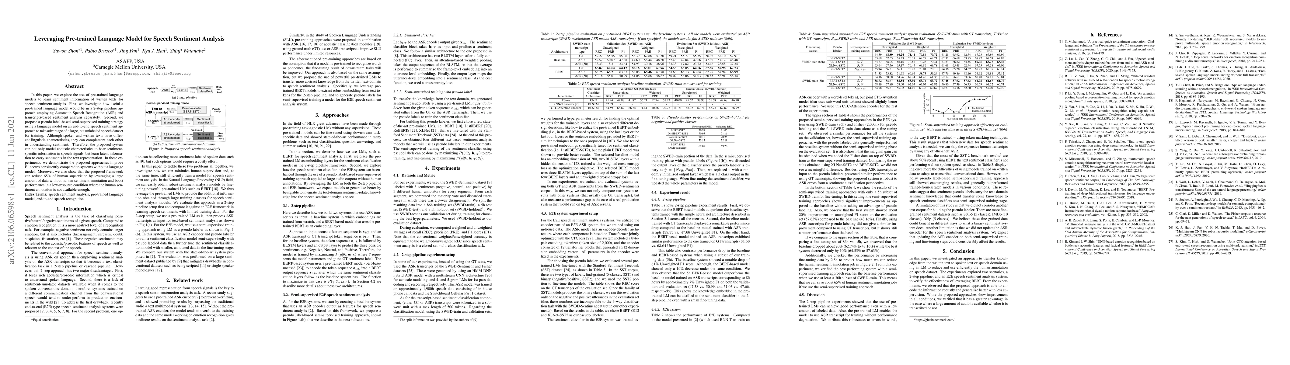 This paper investigates utilizing pre-trained language models for speech sentiment analysis by first exploring their effectiveness in a two-step pipeline with ASR and transcript-based sentiment analysis. It also proposes a semi-supervised training method leveraging unlabeled speech data, demonstrating improved F1 scores and reduced human annotation effort.