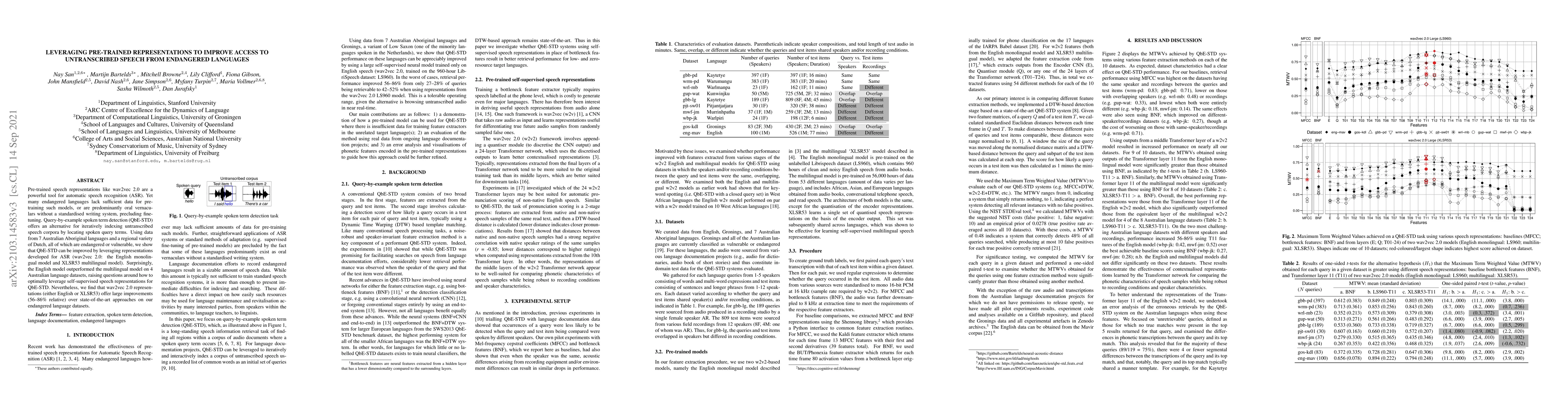 This paper explores using pre-trained speech representations like wav2vec 2.0 to enhance automatic speech recognition for untranscribed speech from endangered languages, demonstrating significant improvements with query-by-example spoken term detection (QbE-STD) over traditional methods. Surprisingly, the English monolingual model outperformed the multilingual model, indicating nuanced challenges in leveraging self-supervised representations for such tasks.