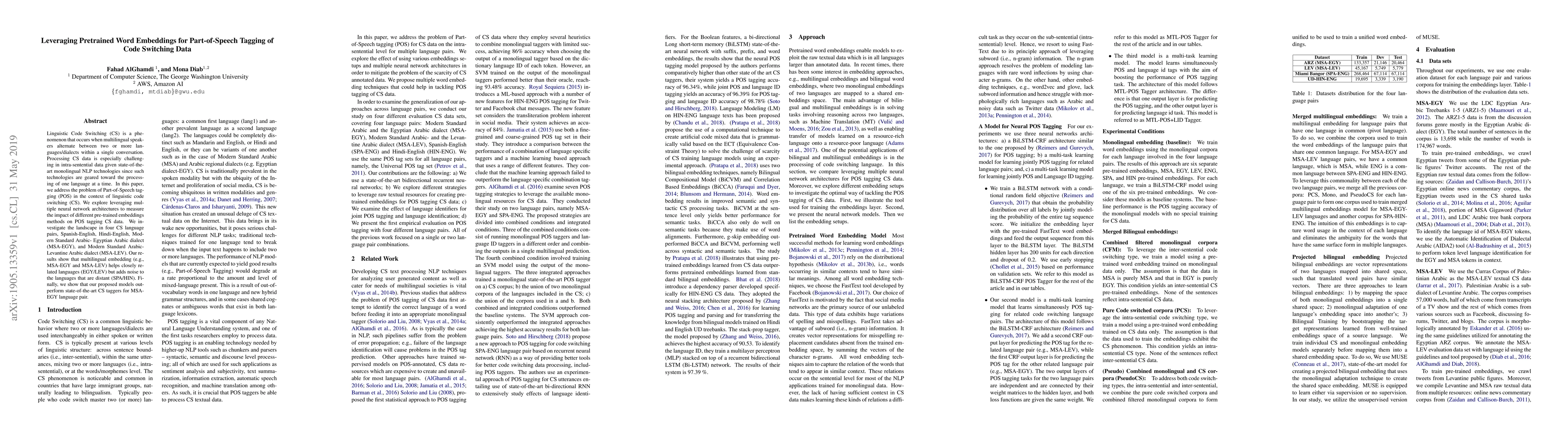 Linguistic Code Switching (CS) is a phenomenon that occurs when multilingual speakers alternate between two or more languages/dialects within a single conversation. Processing CS data is especially challenging in intra-sentential data given state-of-the-art monolingual NLP technologies since such technologies are geared toward the processing of one language at a time. In this paper, we address the problem of Part-of-Speech tagging (POS) in the context of linguistic code switching (CS). We explore leveraging multiple neural network architectures to measure the impact of different pre-trained embeddings methods on POS tagging CS data. We investigate the landscape in four CS language pairs, Spanish-English, Hindi-English, Modern Standard Arabic- Egyptian Arabic dialect (MSA-EGY), and Modern Standard Arabic- Levantine Arabic dialect (MSA-LEV). Our results show that multilingual embedding (e.g., MSA-EGY and MSA-LEV) helps closely related languages (EGY/LEV) but adds noise to the languages that are distant (SPA/HIN). Finally, we show that our proposed models outperform state-of-the-art CS taggers for MSA-EGY language pair.