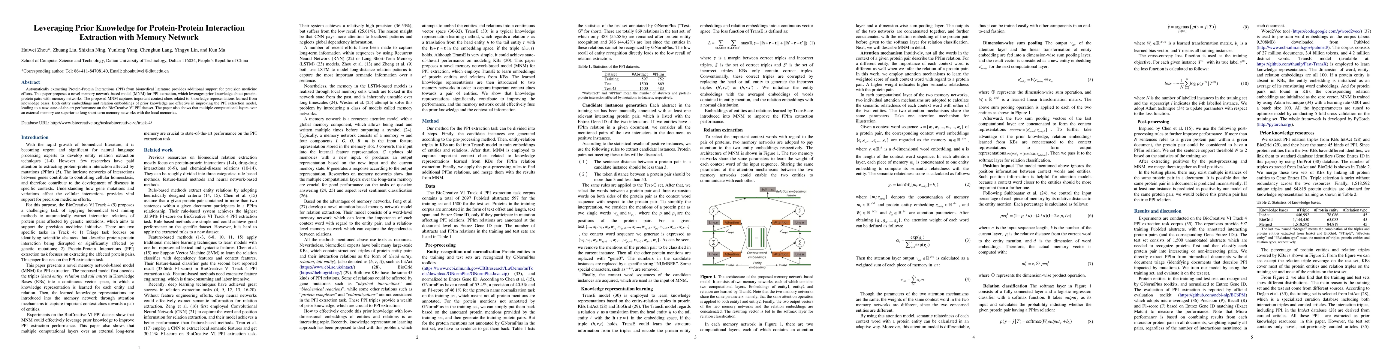 This paper proposes a novel memory network-based model (MNM) for extracting Protein-Protein Interactions (PPI) from biomedical literature, leveraging prior knowledge to enhance performance. The MNM, utilizing both entity and relation embeddings, achieves state-of-the-art results on the BioCreative VI PPI dataset, outperforming LSTM networks with local memories.