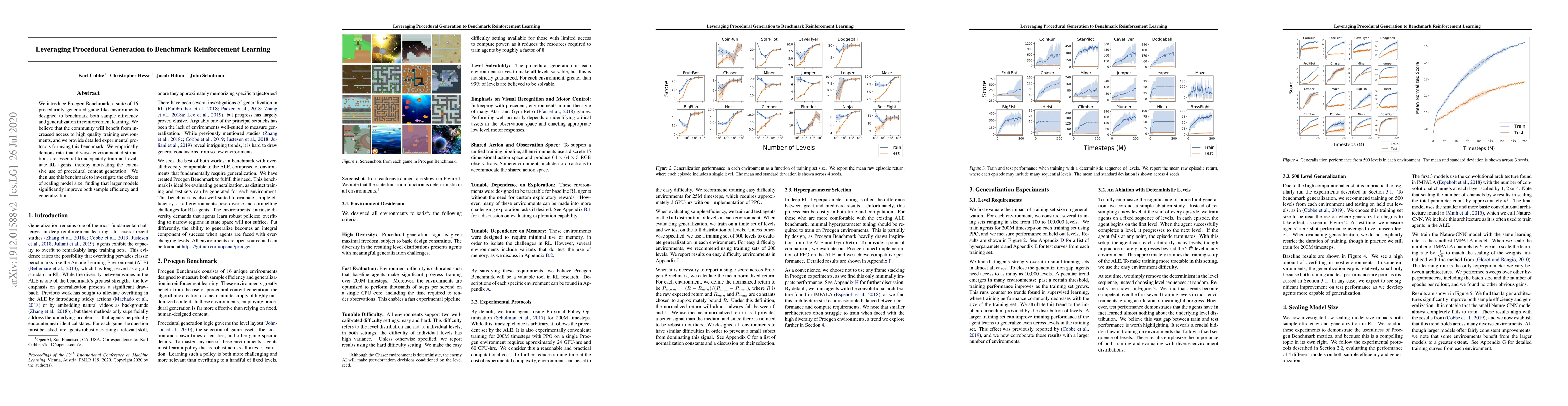 This paper introduces Procgen Benchmark, a suite of 16 procedurally generated environments to evaluate reinforcement learning's sample efficiency and generalization. The study highlights the importance of diverse environment distributions and finds that larger models enhance both sample efficiency and generalization.