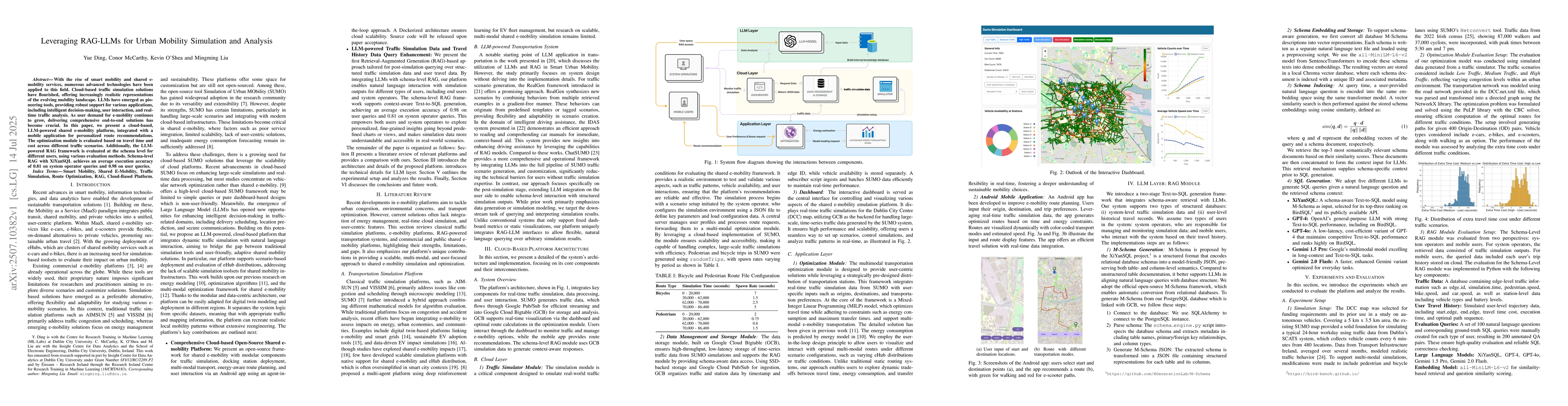 With the rise of smart mobility and shared e-mobility services, numerous advanced technologies have been applied to this field. Cloud-based traffic simulation solutions have flourished, offering increasingly realistic representations of the evolving mobility landscape. LLMs have emerged as pioneering tools, providing robust support for various applications, including intelligent decision-making, user interaction, and real-time traffic analysis. As user demand for e-mobility continues to grow, delivering comprehensive end-to-end solutions has become crucial. In this paper, we present a cloud-based, LLM-powered shared e-mobility platform, integrated with a mobile application for personalized route recommendations. The optimization module is evaluated based on travel time and cost across different traffic scenarios. Additionally, the LLM-powered RAG framework is evaluated at the schema level for different users, using various evaluation methods. Schema-level RAG with XiYanSQL achieves an average execution accuracy of 0.81 on system operator queries and 0.98 on user queries.