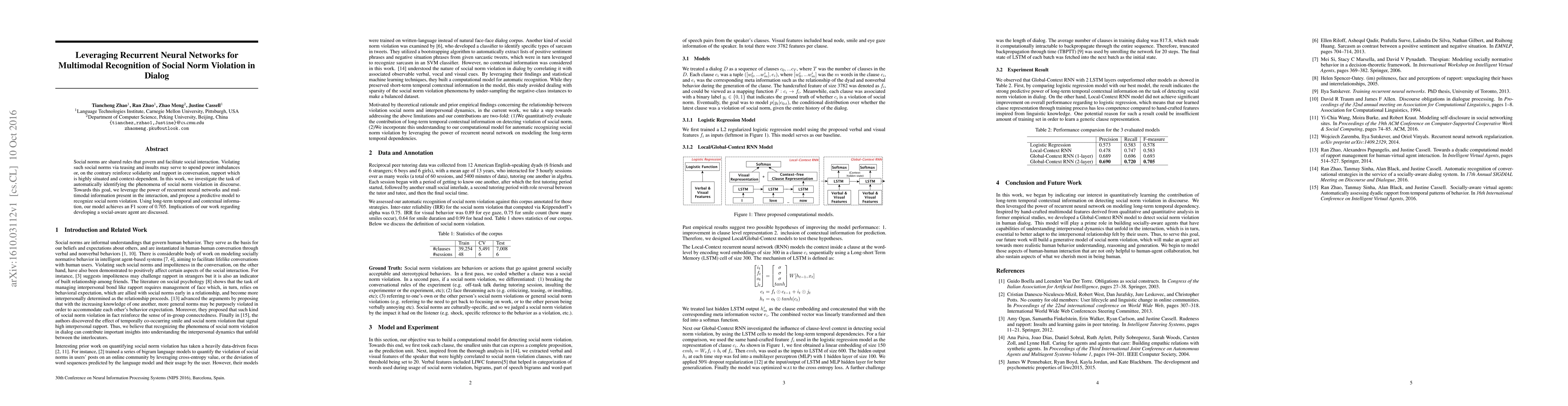 This paper proposes a recurrent neural network model to automatically identify social norm violations in dialog using multimodal information. The model achieves an F1 score of 0.705, highlighting the potential for developing socially aware conversational agents.