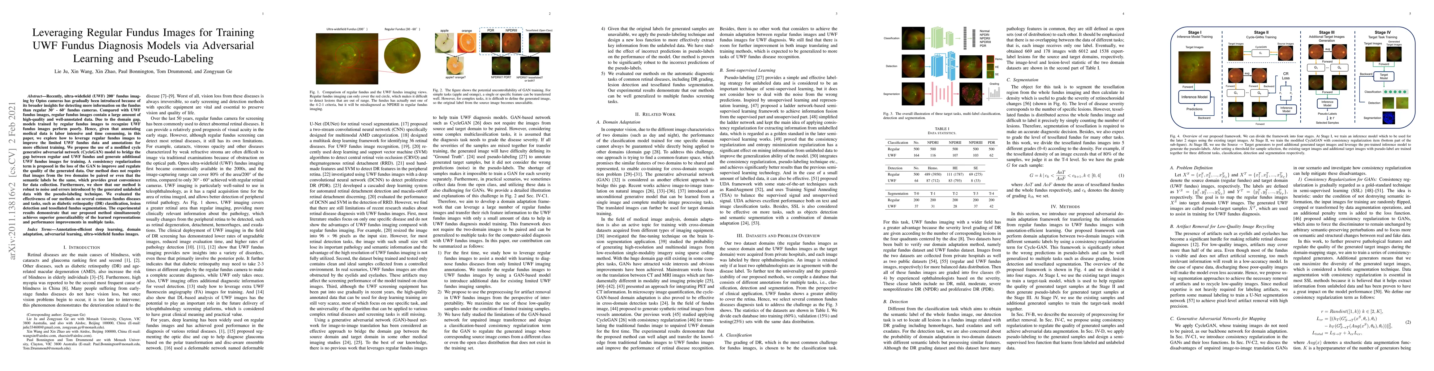 This paper proposes a method using adversarial learning and pseudo-labeling to leverage regular fundus images for training UWF fundus diagnosis models. The approach employs a CycleGAN to bridge the domain gap and generate additional UWF images, enhancing limited UWF data and annotations, while demonstrating robustness to noise and improved performance in tasks like diabetic retinopathy classification.