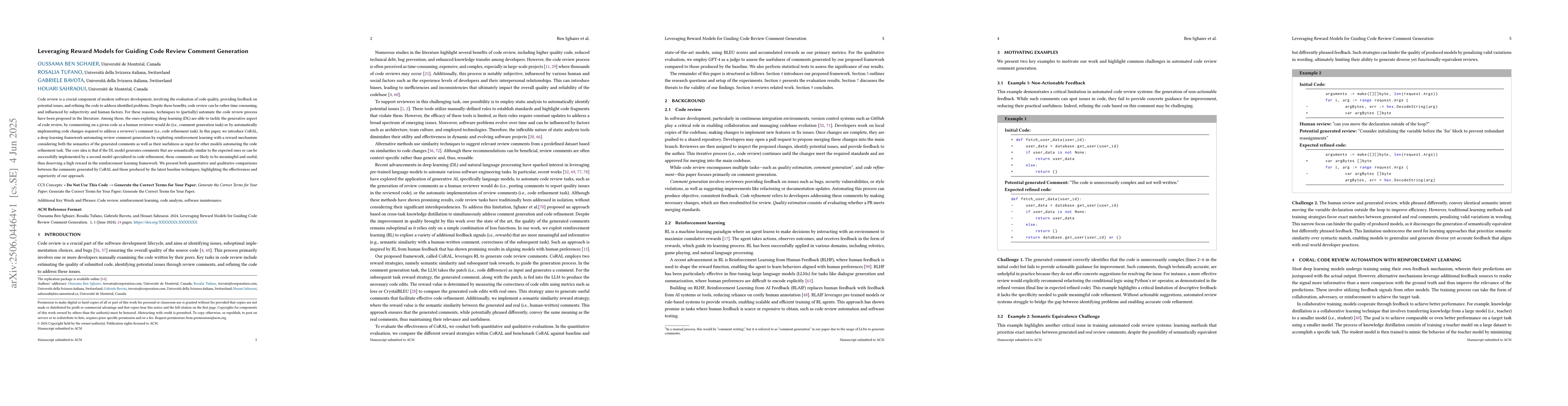 The main technical contribution is CoRAL, a reinforcement learning framework for automated review comment generation that incorporates a reward mechanism based on semantic similarity and usefulness for code refinement.