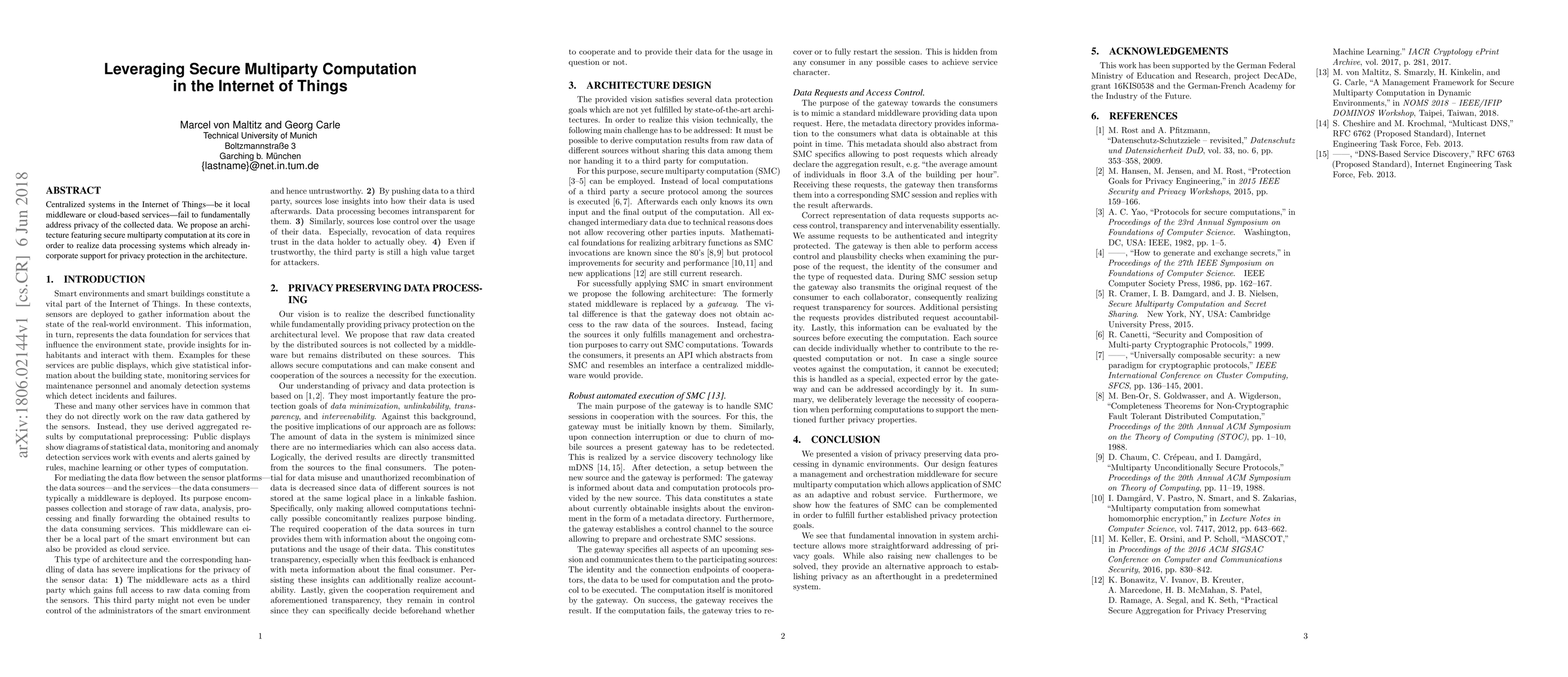 Summary: This paper proposes an architecture for Internet of Things systems that utilizes secure multiparty computation to inherently protect data privacy, addressing the limitations of centralized systems in safeguarding collected data.