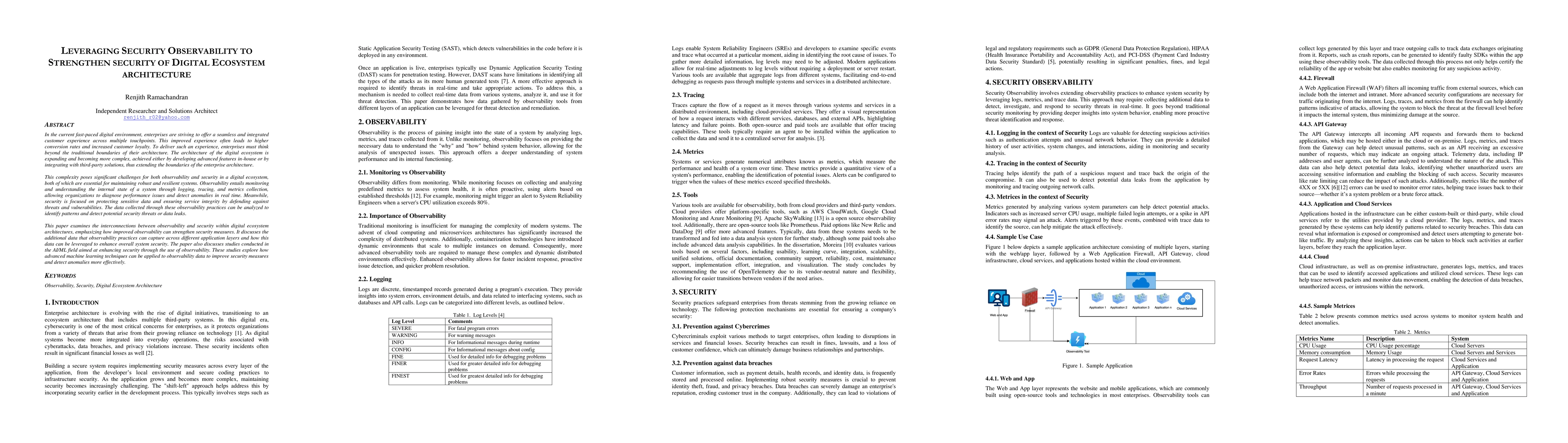 In the current fast-paced digital environment, enterprises are striving to offer a seamless and integrated customer experience across multiple touchpoints. This improved experience often leads to higher conversion rates and increased customer loyalty. To deliver such an experience, enterprises must think beyond the traditional boundaries of their architecture. The architecture of the digital ecosystem is expanding and becoming more complex, achieved either by developing advanced features in-house or by integrating with third-party solutions, thus extending the boundaries of the enterprise architecture. This complexity poses significant challenges for both observability and security in a digital ecosystem, both of which are essential for maintaining robust and resilient systems. Observability entails monitoring and understanding the internal state of a system through logging, tracing, and metrics collection, allowing organizations to diagnose performance issues and detect anomalies in real time. Meanwhile, security is focused on protecting sensitive data and ensuring service integrity by defending against threats and vulnerabilities. The data collected through these observability practices can be analyzed to identify patterns and detect potential security threats or data leaks. This paper examines the interconnections between observability and security within digital ecosystem architectures, emphasizing how improved observability can strengthen security measures. The paper also discusses studies conducted in the AI/ML field aimed at enhancing security through the use of observability. These studies explore how advanced machine learning techniques can be applied to observability data to improve security measures and detect anomalies more effectively.