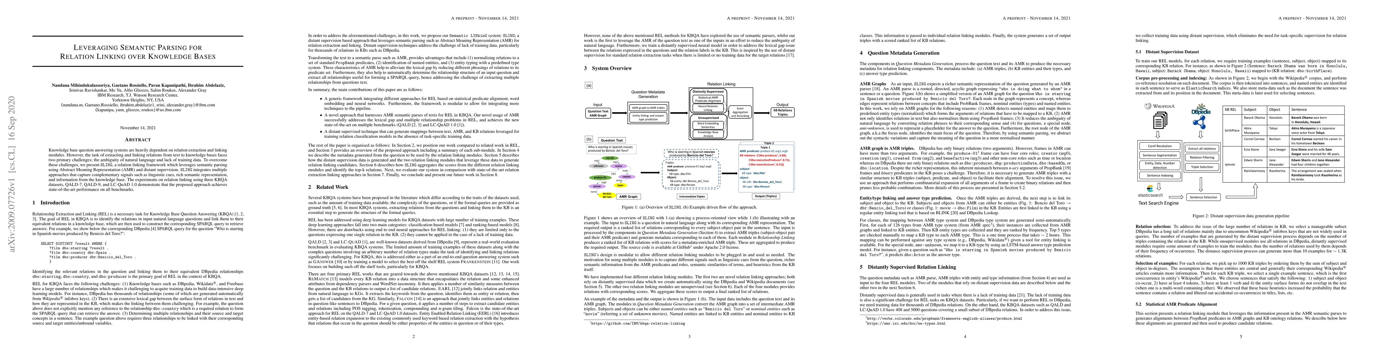 This paper introduces SLING, a framework for relation linking in knowledgebase question answering systems that uses semantic parsing with Abstract Meaning Representation (AMR) and distant supervision. The approach integrates linguistic cues, semantic representation, and knowledgebase information to address natural language ambiguity and data scarcity, achieving state-of-the-art results on three datasets.