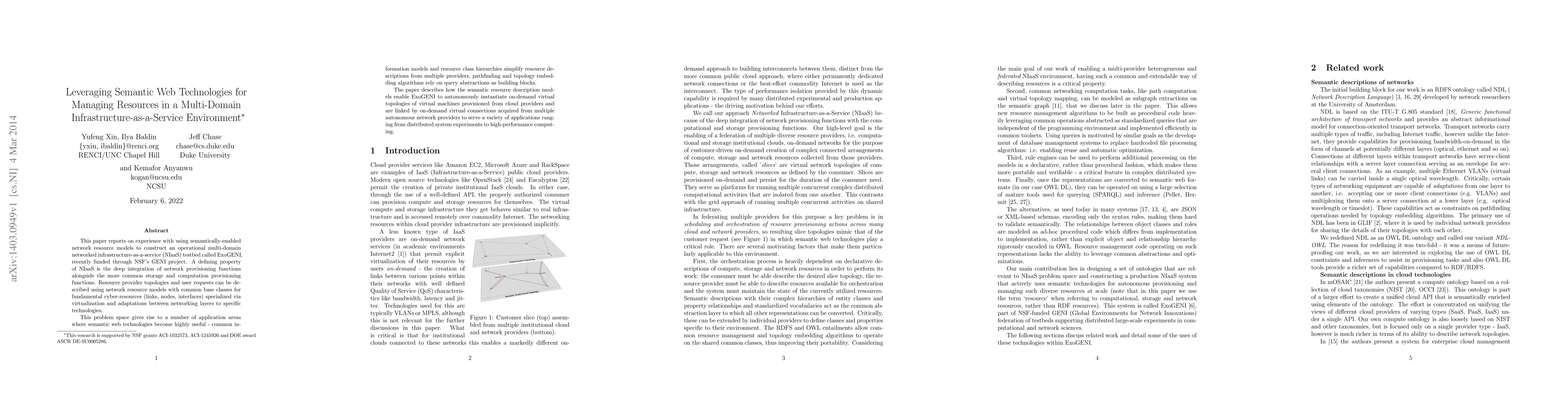 This paper uses semantic web technologies to create a multi-domain networked infrastructure-as-a-service environment, enabling on-demand virtual topologies and connections for various applications. The approach simplifies resource descriptions and improves pathfinding and topology embedding algorithms.