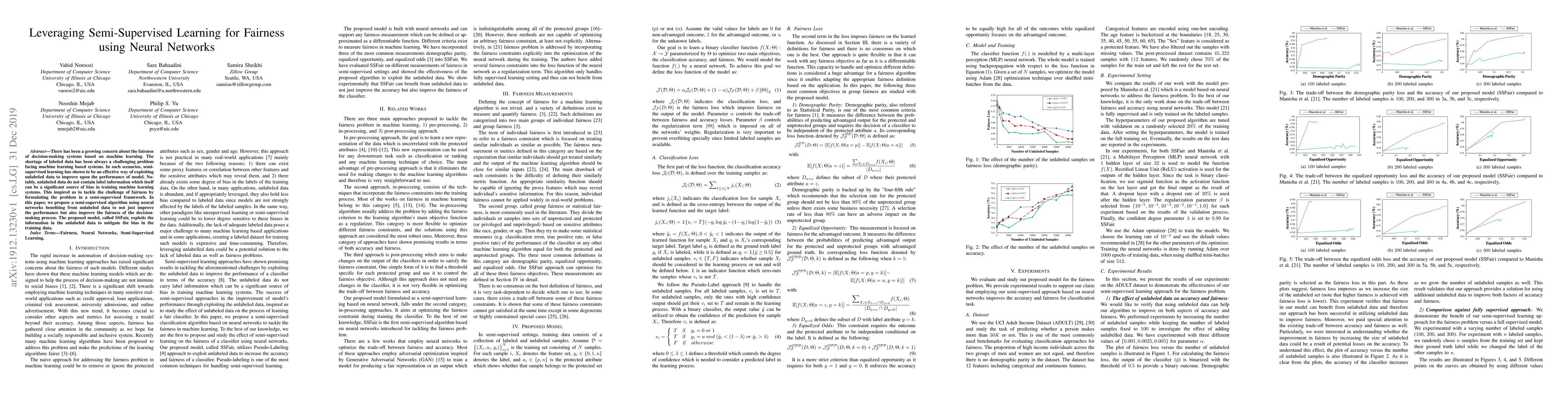 There has been a growing concern about the fairness of decision-making systems based on machine learning. The shortage of labeled data has been always a challenging problem facing machine learning based systems. In such scenarios, semi-supervised learning has shown to be an effective way of exploiting unlabeled data to improve upon the performance of model. Notably, unlabeled data do not contain label information which itself can be a significant source of bias in training machine learning systems. This inspired us to tackle the challenge of fairness by formulating the problem in a semi-supervised framework. In this paper, we propose a semi-supervised algorithm using neural networks benefiting from unlabeled data to not just improve the performance but also improve the fairness of the decision-making process. The proposed model, called SSFair, exploits the information in the unlabeled data to mitigate the bias in the training data.