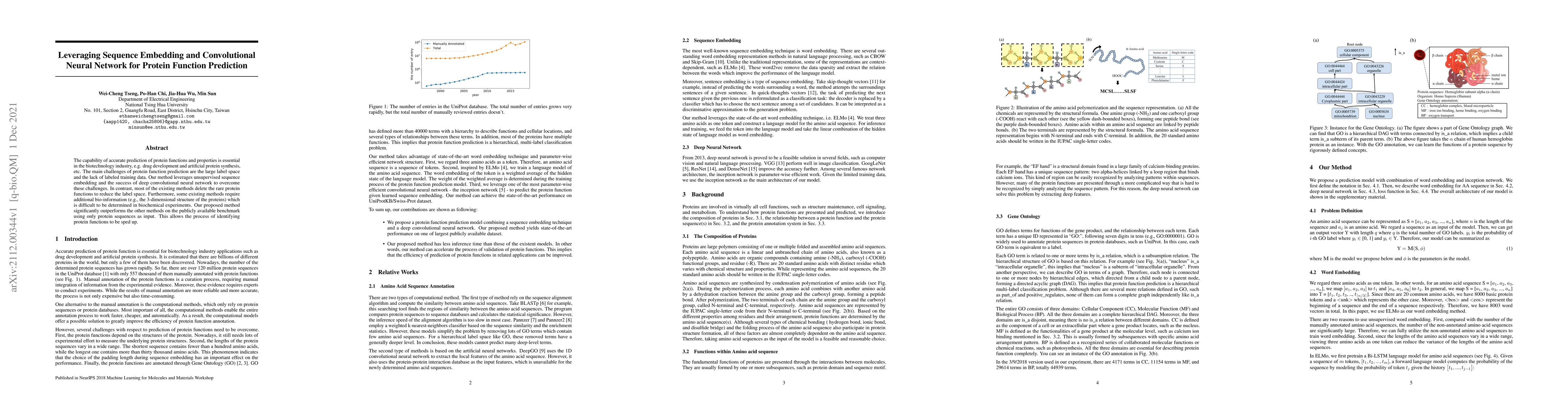 This paper proposes a method using sequence embedding and convolutional neural networks to predict protein functions, addressing the challenges of a large label space and limited training data. Unlike existing methods, it does not require additional bio-information, achieving superior performance on benchmarks using only protein sequences.