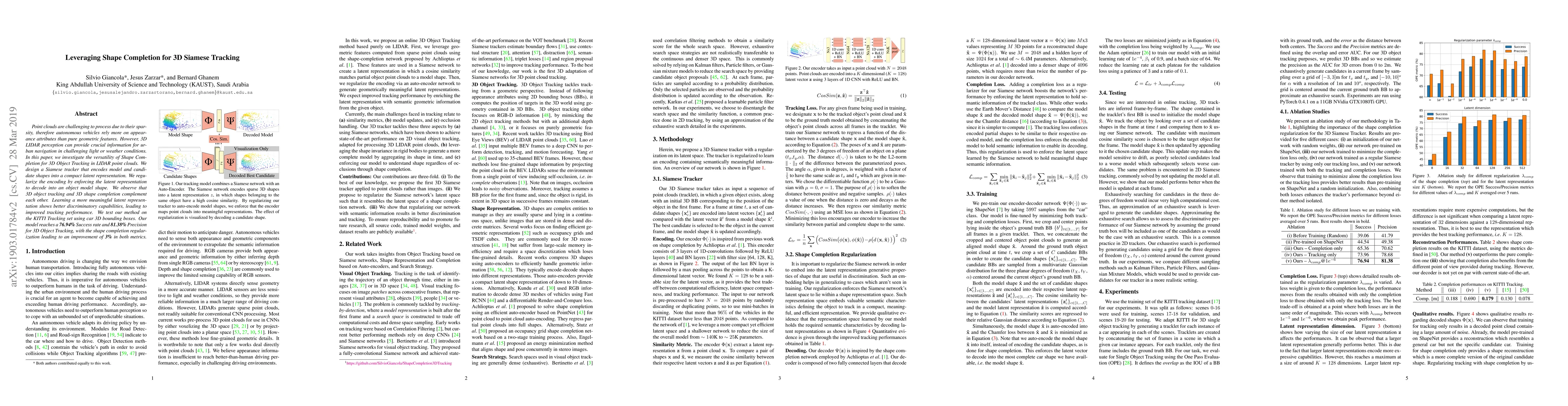 This paper proposes a Siamese tracker for 3D object tracking using LIDAR point clouds, leveraging shape completion to enhance tracking performance. The model achieves a 76.94% success rate and 81.38% precision, with shape completion regularization improving tracking by 3%.