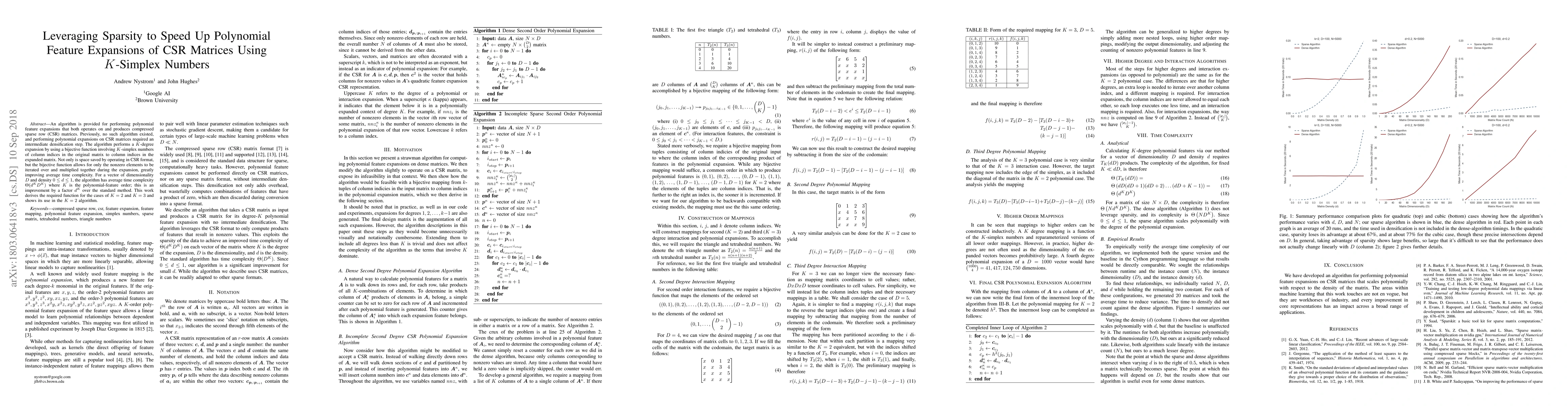 This paper presents an algorithm for polynomial feature expansions on compressed sparse row (CSR) matrices without intermediate densification, leveraging $K$-simplex numbers to improve time complexity. The method achieves an average time complexity of $\Theta(d^KD^K)$, significantly faster than traditional methods.