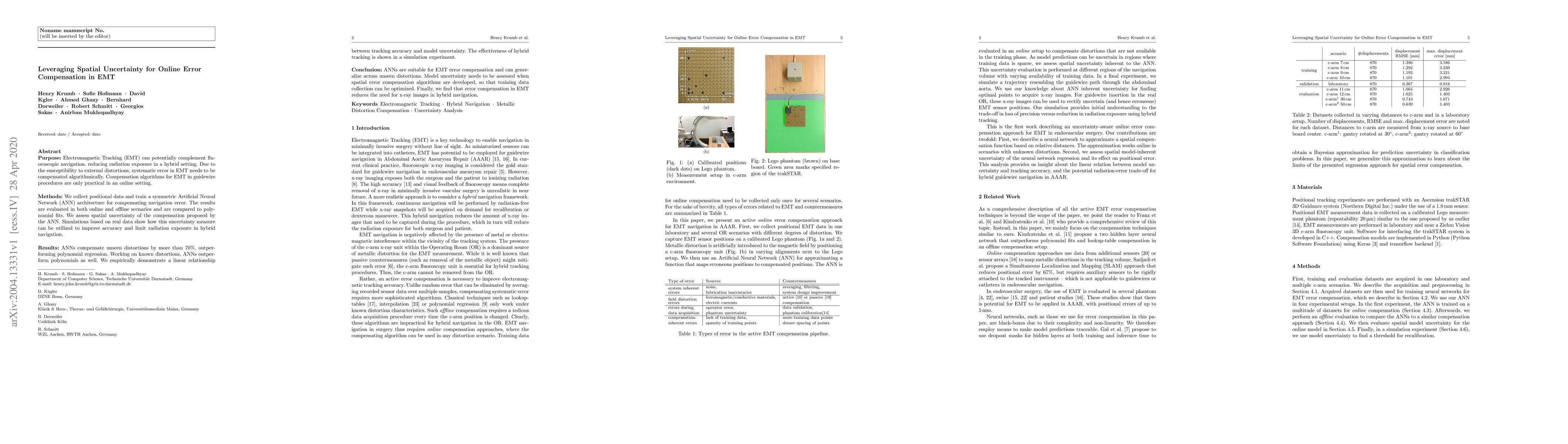 Purpose: Electromagnetic Tracking (EMT) can potentially complement fluoroscopic navigation, reducing radiation exposure in a hybrid setting. Due to the susceptibility to external distortions, systematic error in EMT needs to be compensated algorithmically. Compensation algorithms for EMT in guidewire procedures are only practical in an online setting. Methods: We collect positional data and train a symmetric Artificial Neural Network (ANN) architecture for compensating navigation error. The results are evaluated in both online and offline scenarios and are compared to polynomial fits. We assess spatial uncertainty of the compensation proposed by the ANN. Simulations based on real data show how this uncertainty measure can be utilized to improve accuracy and limit radiation exposure in hybrid navigation. Results: ANNs compensate unseen distortions by more than 70%, outperforming polynomial regression. Working on known distortions, ANNs outperform polynomials as well. We empirically demonstrate a linear relationship between tracking accuracy and model uncertainty. The effectiveness of hybrid tracking is shown in a simulation experiment. Conclusion: ANNs are suitable for EMT error compensation and can generalize across unseen distortions. Model uncertainty needs to be assessed when spatial error compensation algorithms are developed, so that training data collection can be optimized. Finally, we find that error compensation in EMT reduces the need for x-ray images in hybrid navigation.