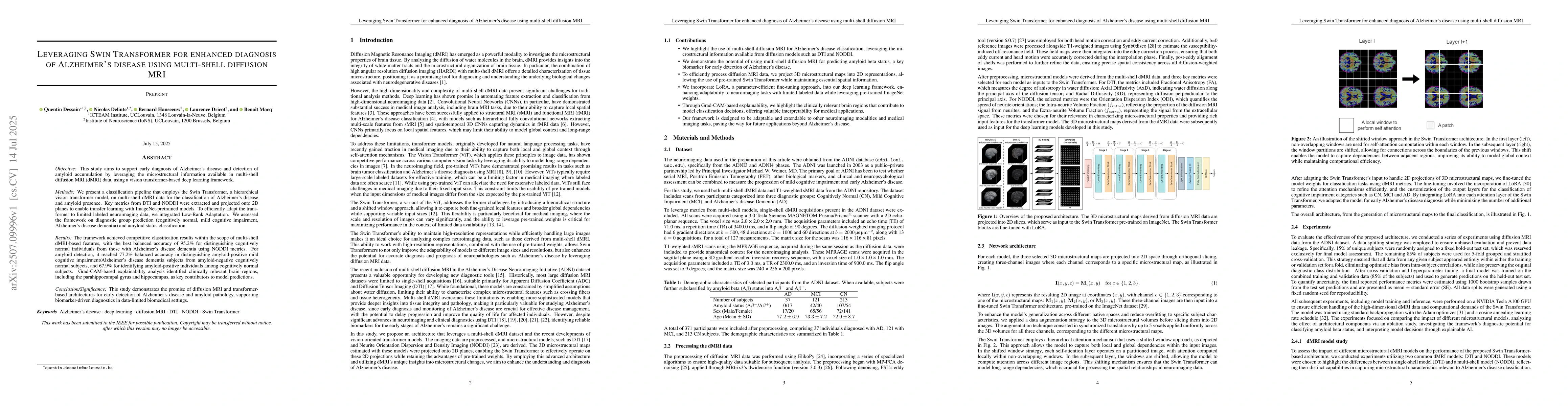 Objective: This study aims to support early diagnosis of Alzheimer's disease and detection of amyloid accumulation by leveraging the microstructural information available in multi-shell diffusion MRI (dMRI) data, using a vision transformer-based deep learning framework. Methods: We present a classification pipeline that employs the Swin Transformer, a hierarchical vision transformer model, on multi-shell dMRI data for the classification of Alzheimer's disease and amyloid presence. Key metrics from DTI and NODDI were extracted and projected onto 2D planes to enable transfer learning with ImageNet-pretrained models. To efficiently adapt the transformer to limited labeled neuroimaging data, we integrated Low-Rank Adaptation. We assessed the framework on diagnostic group prediction (cognitively normal, mild cognitive impairment, Alzheimer's disease dementia) and amyloid status classification. Results: The framework achieved competitive classification results within the scope of multi-shell dMRI-based features, with the best balanced accuracy of 95.2% for distinguishing cognitively normal individuals from those with Alzheimer's disease dementia using NODDI metrics. For amyloid detection, it reached 77.2% balanced accuracy in distinguishing amyloid-positive mild cognitive impairment/Alzheimer's disease dementia subjects from amyloid-negative cognitively normal subjects, and 67.9% for identifying amyloid-positive individuals among cognitively normal subjects. Grad-CAM-based explainability analysis identified clinically relevant brain regions, including the parahippocampal gyrus and hippocampus, as key contributors to model predictions. Conclusion: This study demonstrates the promise of diffusion MRI and transformer-based architectures for early detection of Alzheimer's disease and amyloid pathology, supporting biomarker-driven diagnostics in data-limited biomedical settings.