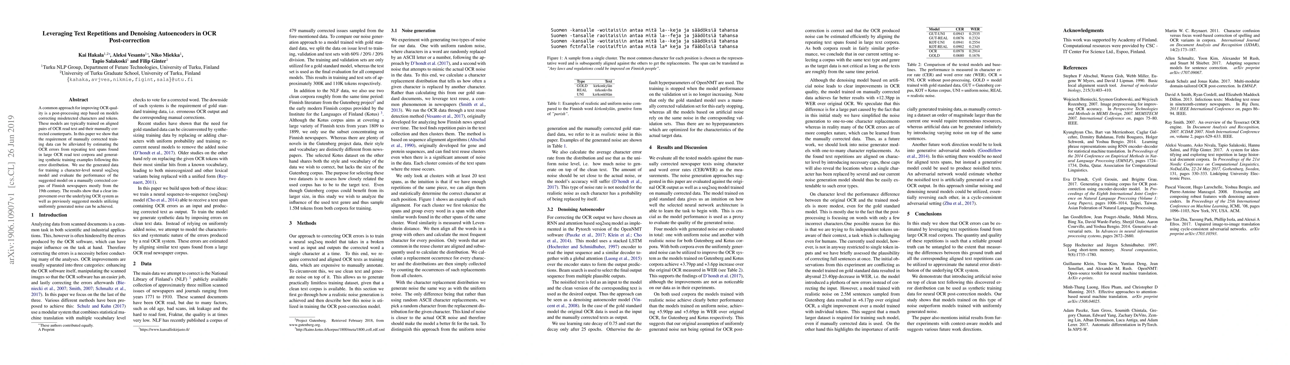 This paper proposes a method to improve OCR quality by generating synthetic training data from text repetitions in large OCR corpora, eliminating the need for manually corrected text pairs. The approach trains a character-level neural seq2seq model, demonstrating superior performance over the original OCR system and other models using uniformly generated noise, as shown on a Finnish newspaper corpus from the 19th century.