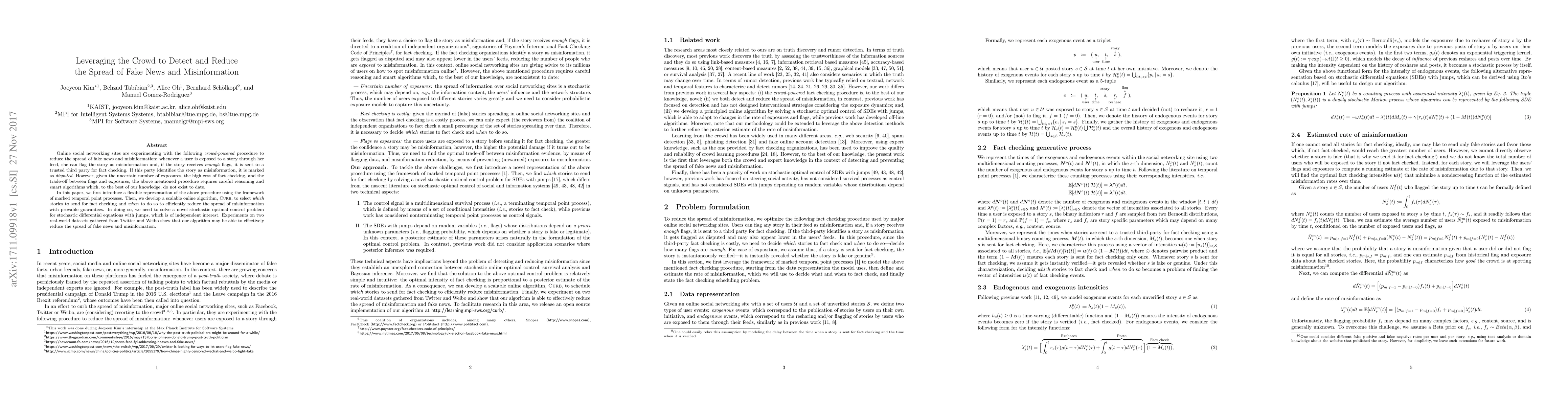 Online social networking sites are experimenting with the following crowd-powered procedure to reduce the spread of fake news and misinformation: whenever a user is exposed to a story through her feed, she can flag the story as misinformation and, if the story receives enough flags, it is sent to a trusted third party for fact checking. If this party identifies the story as misinformation, it is marked as disputed. However, given the uncertain number of exposures, the high cost of fact checking, and the trade-off between flags and exposures, the above mentioned procedure requires careful reasoning and smart algorithms which, to the best of our knowledge, do not exist to date. In this paper, we first introduce a flexible representation of the above procedure using the framework of marked temporal point processes. Then, we develop a scalable online algorithm, Curb, to select which stories to send for fact checking and when to do so to efficiently reduce the spread of misinformation with provable guarantees. In doing so, we need to solve a novel stochastic optimal control problem for stochastic differential equations with jumps, which is of independent interest. Experiments on two real-world datasets gathered from Twitter and Weibo show that our algorithm may be able to effectively reduce the spread of fake news and misinformation.