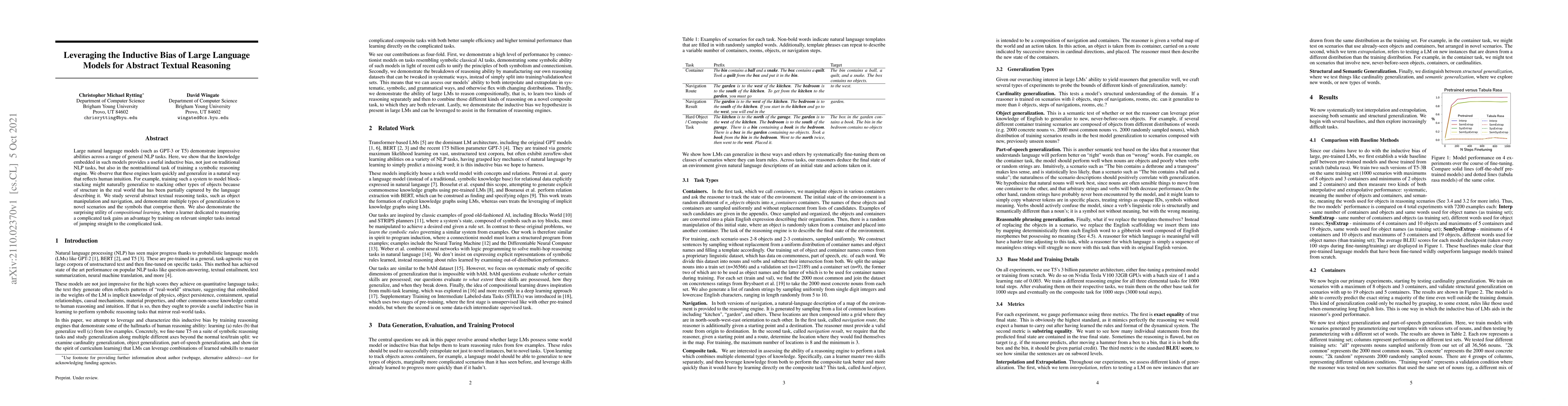 This paper explores how large language models, like GPT-3 or T5, serve as effective inductive biases for abstract textual reasoning tasks, enabling symbolic reasoning engines to quickly learn and generalize based on human intuition. The study highlights the benefits of compositional learning, where simpler tasks aid in mastering complex ones.
