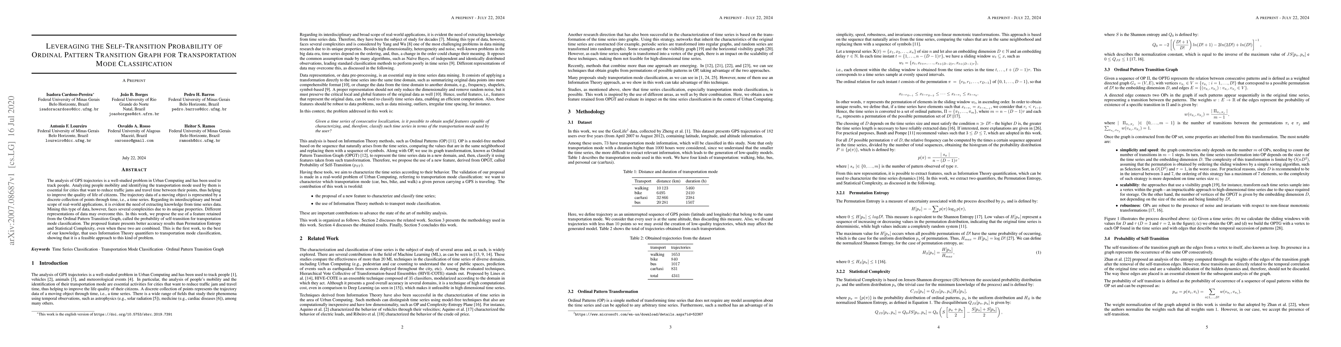 The analysis of GPS trajectories is a well-studied problem in Urban Computing and has been used to track people. Analyzing people mobility and identifying the transportation mode used by them is essential for cities that want to reduce traffic jams and travel time between their points, thus helping to improve the quality of life of citizens. The trajectory data of a moving object is represented by a discrete collection of points through time, i.e., a time series. Regarding its interdisciplinary and broad scope of real-world applications, it is evident the need of extracting knowledge from time series data. Mining this type of data, however, faces several complexities due to its unique properties. Different representations of data may overcome this. In this work, we propose the use of a feature retained from the Ordinal Pattern Transition Graph, called the probability of self-transition for transportation mode classification. The proposed feature presents better accuracy results than Permutation Entropy and Statistical Complexity, even when these two are combined. This is the first work, to the best of our knowledge, that uses Information Theory quantifiers to transportation mode classification, showing that it is a feasible approach to this kind of problem.