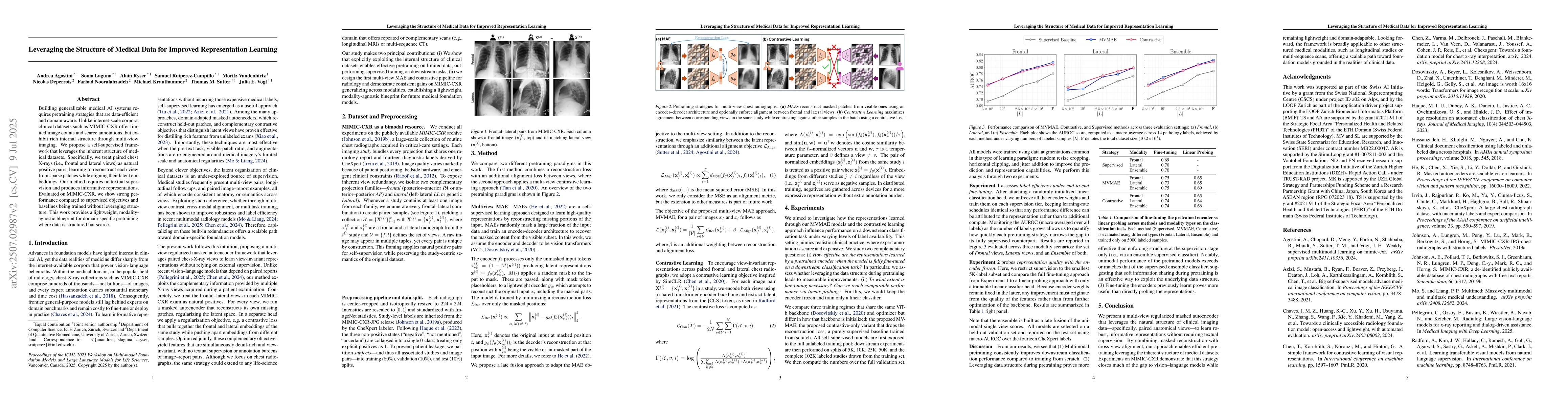 Building generalizable medical AI systems requires pretraining strategies that are data-efficient and domain-aware. Unlike internet-scale corpora, clinical datasets such as MIMIC-CXR offer limited image counts and scarce annotations, but exhibit rich internal structure through multi-view imaging. We propose a self-supervised framework that leverages the inherent structure of medical datasets. Specifically, we treat paired chest X-rays (i.e., frontal and lateral views) as natural positive pairs, learning to reconstruct each view from sparse patches while aligning their latent embeddings. Our method requires no textual supervision and produces informative representations. Evaluated on MIMIC-CXR, we show strong performance compared to supervised objectives and baselines being trained without leveraging structure. This work provides a lightweight, modality-agnostic blueprint for domain-specific pretraining where data is structured but scarce