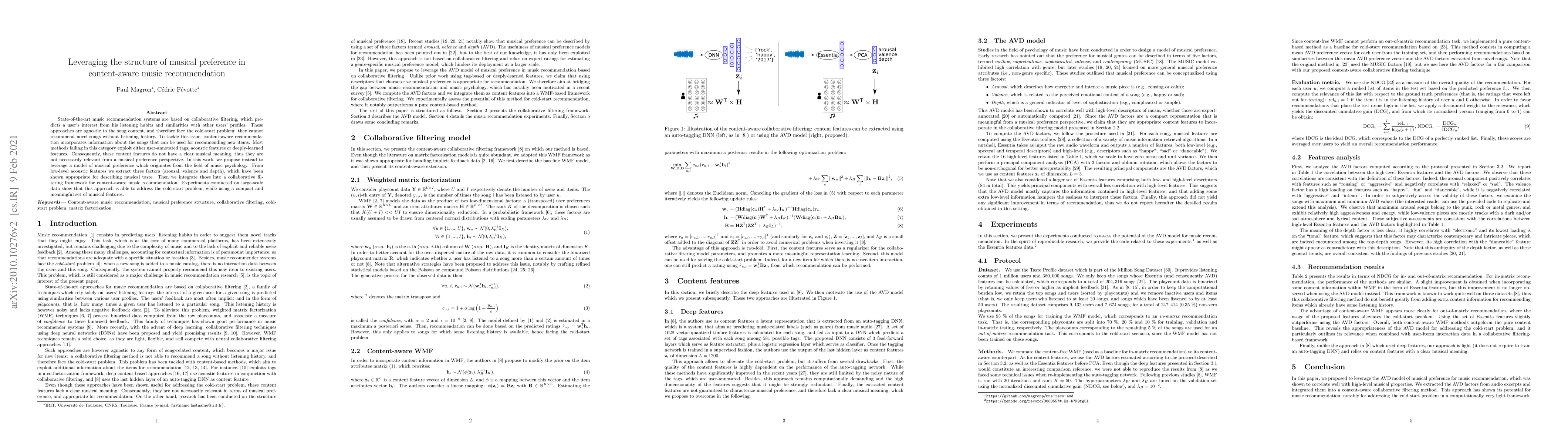 This paper proposes a content-aware music recommendation system that leverages musical preference factors—arousal, valence, and depth—derived from music psychology to improve recommendations, addressing the cold-start problem by using meaningful musical features instead of arbitrary content features. Experiments demonstrate its effectiveness in recommending novel songs.