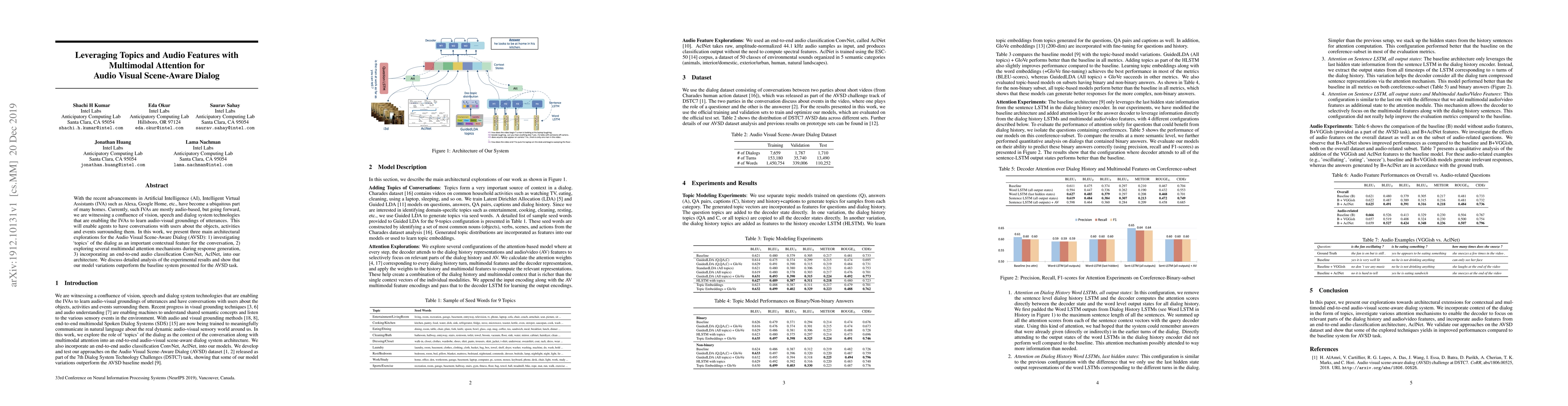 This paper explores advanced architectures for Audio Visual Scene-Aware Dialog, integrating topics, multimodal attention mechanisms, and an audio classification ConvNet to enhance conversational agents' understanding of audio-visual context. Experimental results demonstrate improved performance over baseline systems.