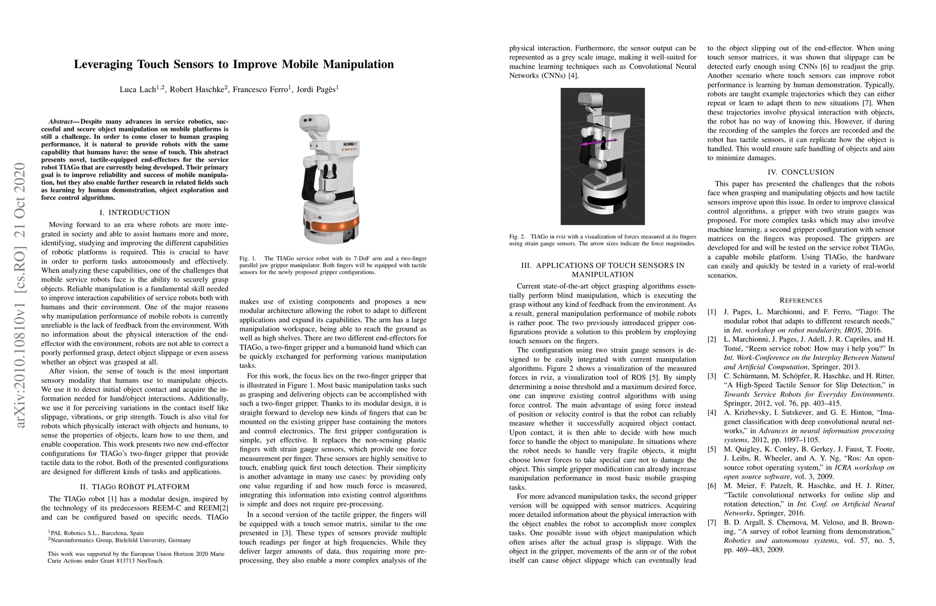 Despite many advances in service robotics, successful and secure object manipulation on mobile platforms is still a challenge. In order to come closer to human grasping performance, it is natural to provide robots with the same capability that humans have: the sense of touch. This abstract presents novel, tactile-equipped end-effectors for the service robot TIAGo that are currently being developed. Their primary goal is to improve reliability and success of mobile manipulation, but they also enable further research in related fields such as learning by human demonstration, object exploration and force control algorithms.