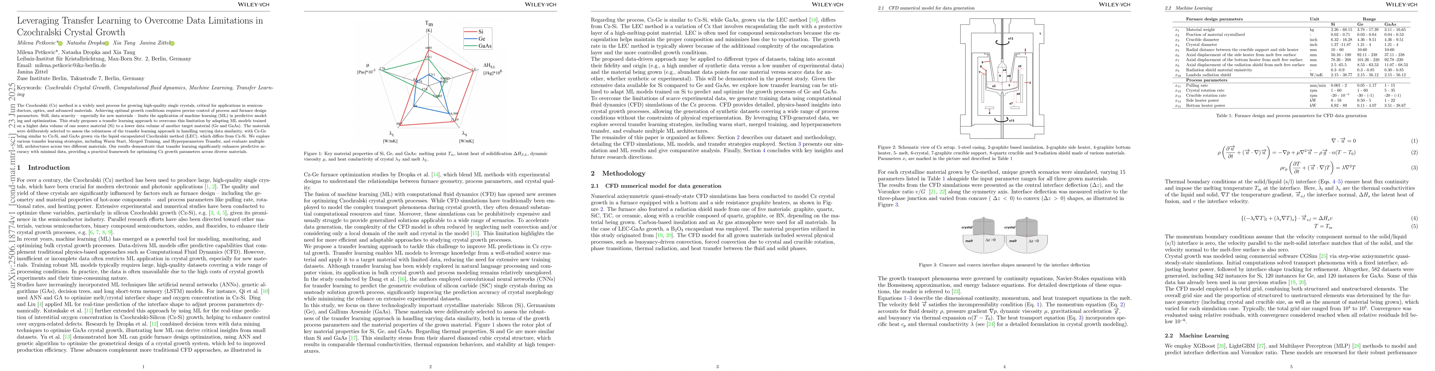 The Czochralski (Cz) method is a widely used process for growing high-quality single crystals, critical for applications in semiconductors, optics, and advanced materials. Achieving optimal growth conditions requires precise control of process and furnace design parameters. Still, data scarcity -- especially for new materials -- limits the application of machine learning (ML) in predictive modeling and optimization. This study proposes a transfer learning approach to overcome this limitation by adapting ML models trained on a higher data volume of one source material (Si) to a lower data volume of another target material (Ge and GaAs). The materials were deliberately selected to assess the robustness of the transfer learning approach in handling varying data similarity, with Cz-Ge being similar to Cz-Si, and GaAs grown via the liquid encapsulated Czochralski method (LEC), which differs from Cz-Si. We explore various transfer learning strategies, including Warm Start, Merged Training, and Hyperparameters Transfer, and evaluate multiple ML architectures across two different materials. Our results demonstrate that transfer learning significantly enhances predictive accuracy with minimal data, providing a practical framework for optimizing Cz growth parameters across diverse materials.