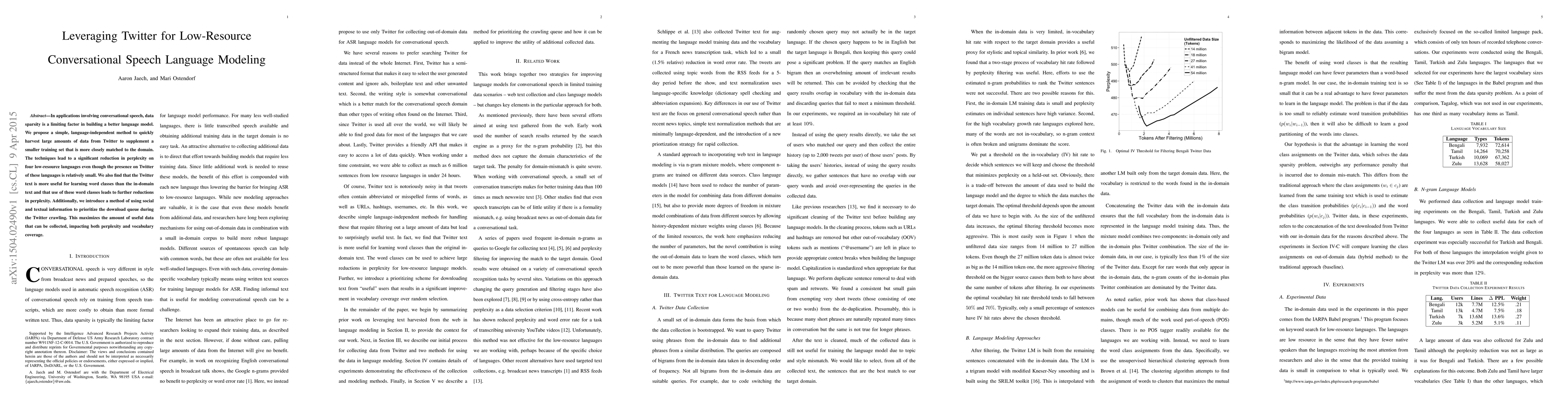 Researchers developed a method to collect large amounts of data from Twitter to supplement training sets for low-resource languages, resulting in significant improvements in language model perplexity. This approach also prioritizes useful data based on social and textual information.