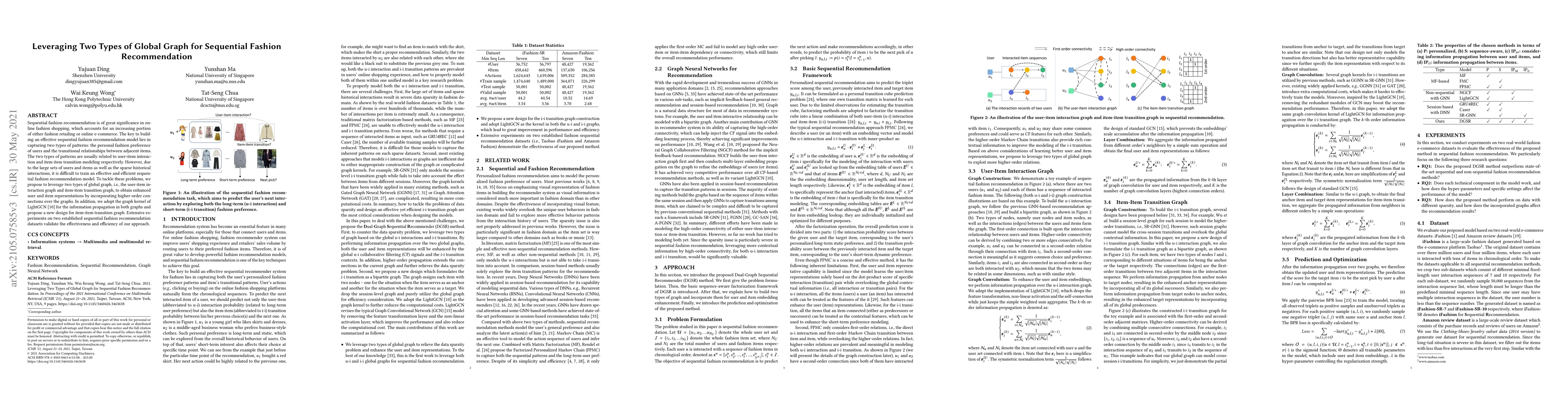 This paper proposes a method to enhance sequential fashion recommendation by leveraging two global graphs: a user-item interaction graph and an item-item transition graph to capture user preferences and item relationships. The approach uses graph kernels for information propagation and demonstrates improved performance on benchmark datasets.