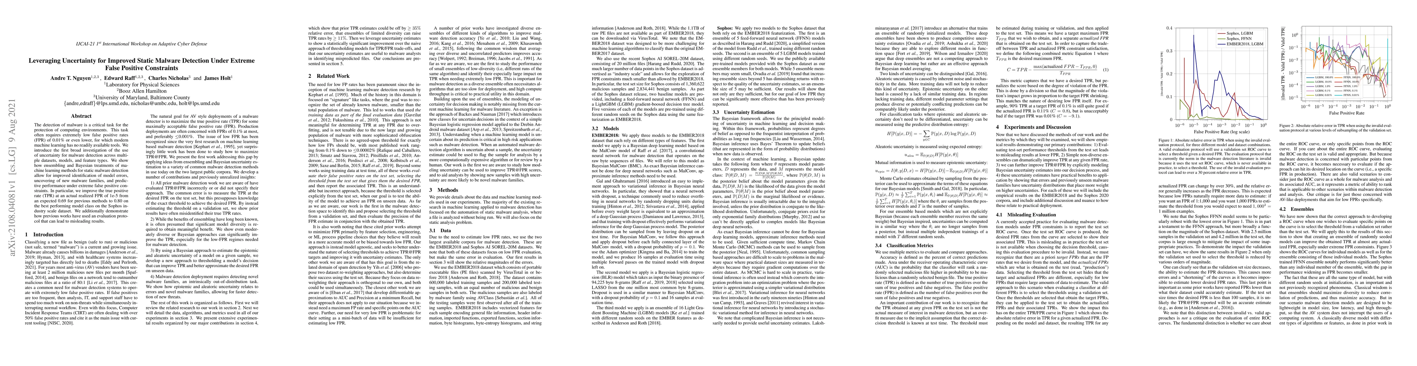 The detection of malware is a critical task for the protection of computing environments. This task often requires extremely low false positive rates (FPR) of 0.01% or even lower, for which modern machine learning has no readily available tools. We introduce the first broad investigation of the use of uncertainty for malware detection across multiple datasets, models, and feature types. We show how ensembling and Bayesian treatments of machine learning methods for static malware detection allow for improved identification of model errors, uncovering of new malware families, and predictive performance under extreme false positive constraints. In particular, we improve the true positive rate (TPR) at an actual realized FPR of 1e-5 from an expected 0.69 for previous methods to 0.80 on the best performing model class on the Sophos industry scale dataset. We additionally demonstrate how previous works have used an evaluation protocol that can lead to misleading results.