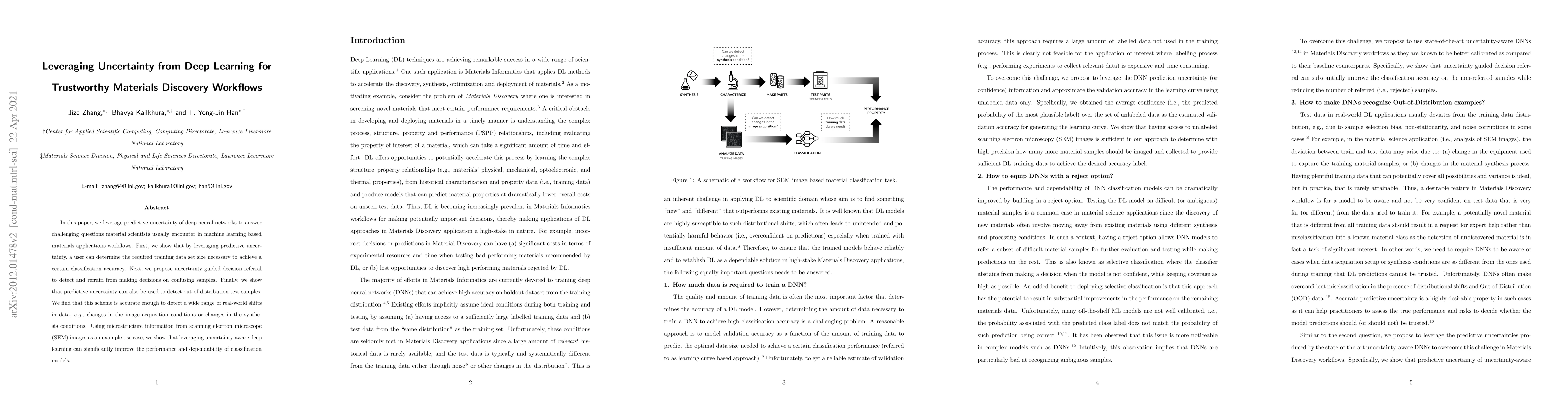 This paper utilizes predictive uncertainty from deep learning to enhance materials discovery workflows, determining optimal training data sizes, avoiding decisions on confusing samples, and detecting out-of-distribution test samples, thereby improving classification model performance and reliability.