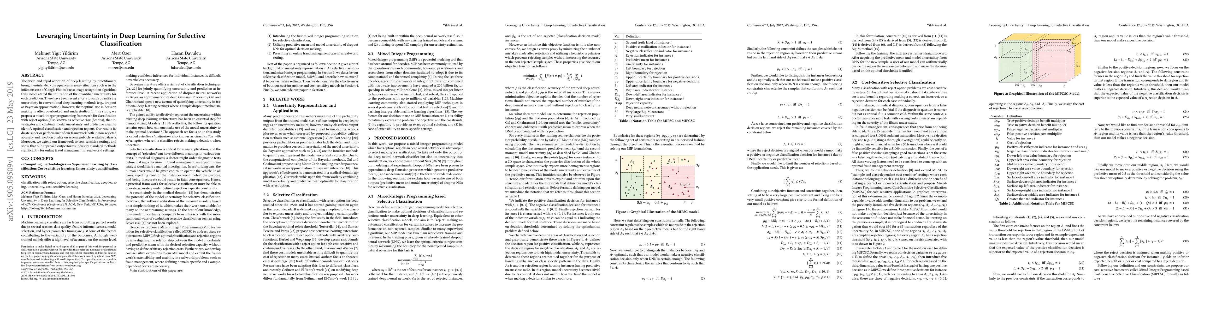 The wide and rapid adoption of deep learning by practitioners brought unintended consequences in many situations such as in the infamous case of Google Photos' racist image recognition algorithm; thus, necessitated the utilization of the quantified uncertainty for each prediction. There have been recent efforts towards quantifying uncertainty in conventional deep learning methods (e.g., dropout as Bayesian approximation); however, their optimal use in decision making is often overlooked and understudied. In this study, we propose a mixed-integer programming framework for classification with reject option (also known as selective classification), that investigates and combines model uncertainty and predictive mean to identify optimal classification and rejection regions. Our results indicate superior performance of our framework both in non-rejected accuracy and rejection quality on several publicly available datasets. Moreover, we extend our framework to cost-sensitive settings and show that our approach outperforms industry standard methods significantly for online fraud management in real-world settings.