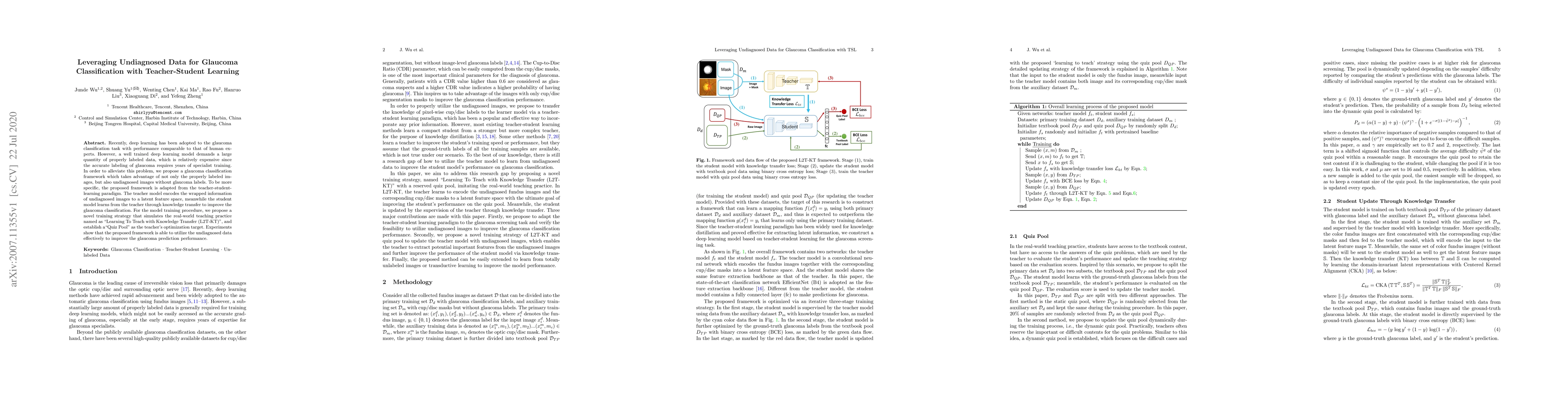 Recently, deep learning has been adopted to the glaucoma classification task with performance comparable to that of human experts. However, a well trained deep learning model demands a large quantity of properly labeled data, which is relatively expensive since the accurate labeling of glaucoma requires years of specialist training. In order to alleviate this problem, we propose a glaucoma classification framework which takes advantage of not only the properly labeled images, but also undiagnosed images without glaucoma labels. To be more specific, the proposed framework is adapted from the teacher-student-learning paradigm. The teacher model encodes the wrapped information of undiagnosed images to a latent feature space, meanwhile the student model learns from the teacher through knowledge transfer to improve the glaucoma classification. For the model training procedure, we propose a novel training strategy that simulates the real-world teaching practice named as 'Learning To Teach with Knowledge Transfer (L2T-KT)', and establish a 'Quiz Pool' as the teacher's optimization target. Experiments show that the proposed framework is able to utilize the undiagnosed data effectively to improve the glaucoma prediction performance.