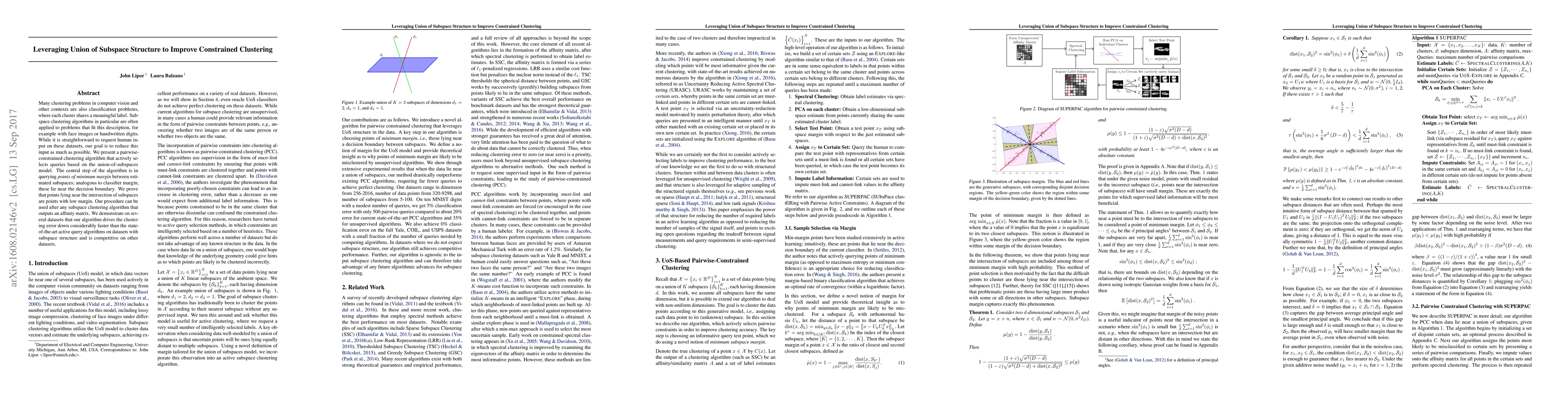 Many clustering problems in computer vision and other contexts are also classification problems, where each cluster shares a meaningful label. Subspace clustering algorithms in particular are often applied to problems that fit this description, for example with face images or handwritten digits. While it is straightforward to request human input on these datasets, our goal is to reduce this input as much as possible. We present a pairwise-constrained clustering algorithm that actively selects queries based on the union-of-subspaces model. The central step of the algorithm is in querying points of minimum margin between estimated subspaces; analogous to classifier margin, these lie near the decision boundary. We prove that points lying near the intersection of subspaces are points with low margin. Our procedure can be used after any subspace clustering algorithm that outputs an affinity matrix. We demonstrate on several datasets that our algorithm drives the clustering error down considerably faster than the state-of-the-art active query algorithms on datasets with subspace structure and is competitive on other datasets.